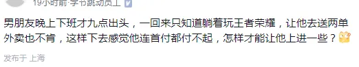 网上看到有人发帖求助,说:"男朋友晚上下班才九点出头,一回来只知道玩游戏,让他去送两单外卖也不肯,这样下去感觉他连首付都付不起,该怎么让他上进一点?"