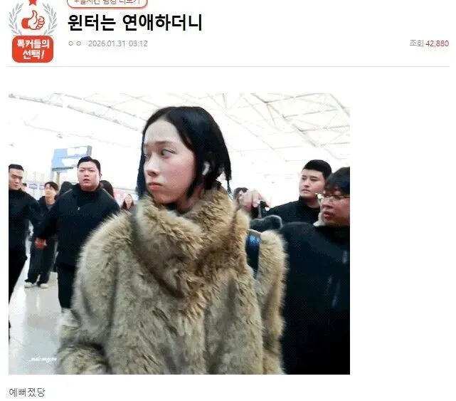 这一时间线确实巧合。就在恋爱传闻闹得沸沸扬扬之际,Winter果断剪去了长发,回归了类似出道初期的经典波波头造型。随后,韩国知名网络社区Pann上一篇热帖便直接点明:“自从Winter恋爱后,她变得更美了。” 这一说法迅速将“颜值蜕变”与“恋情状态”捆绑,推上了舆论风口。