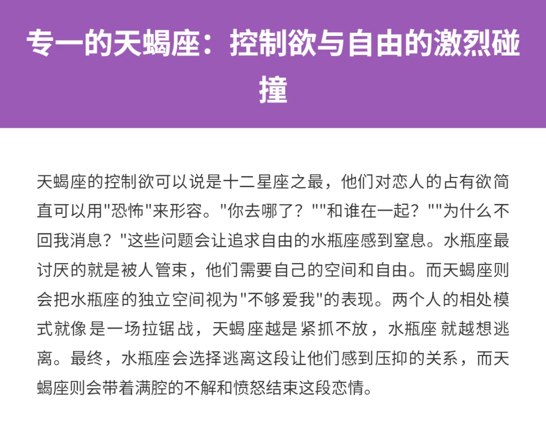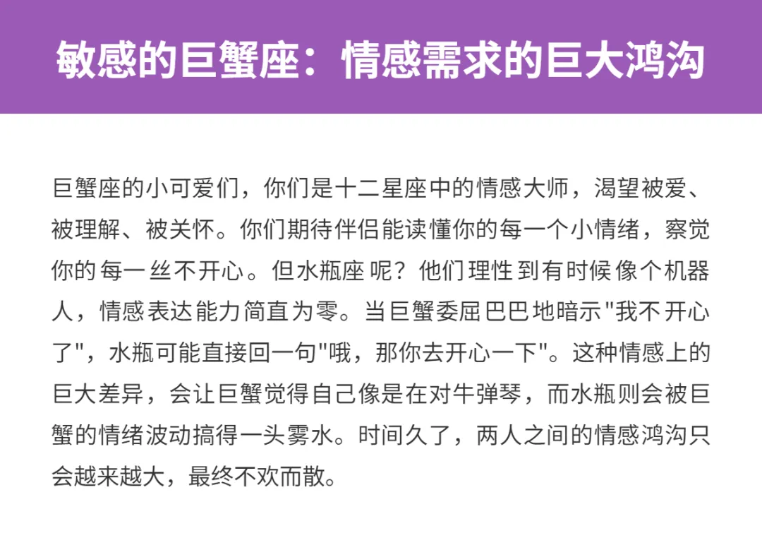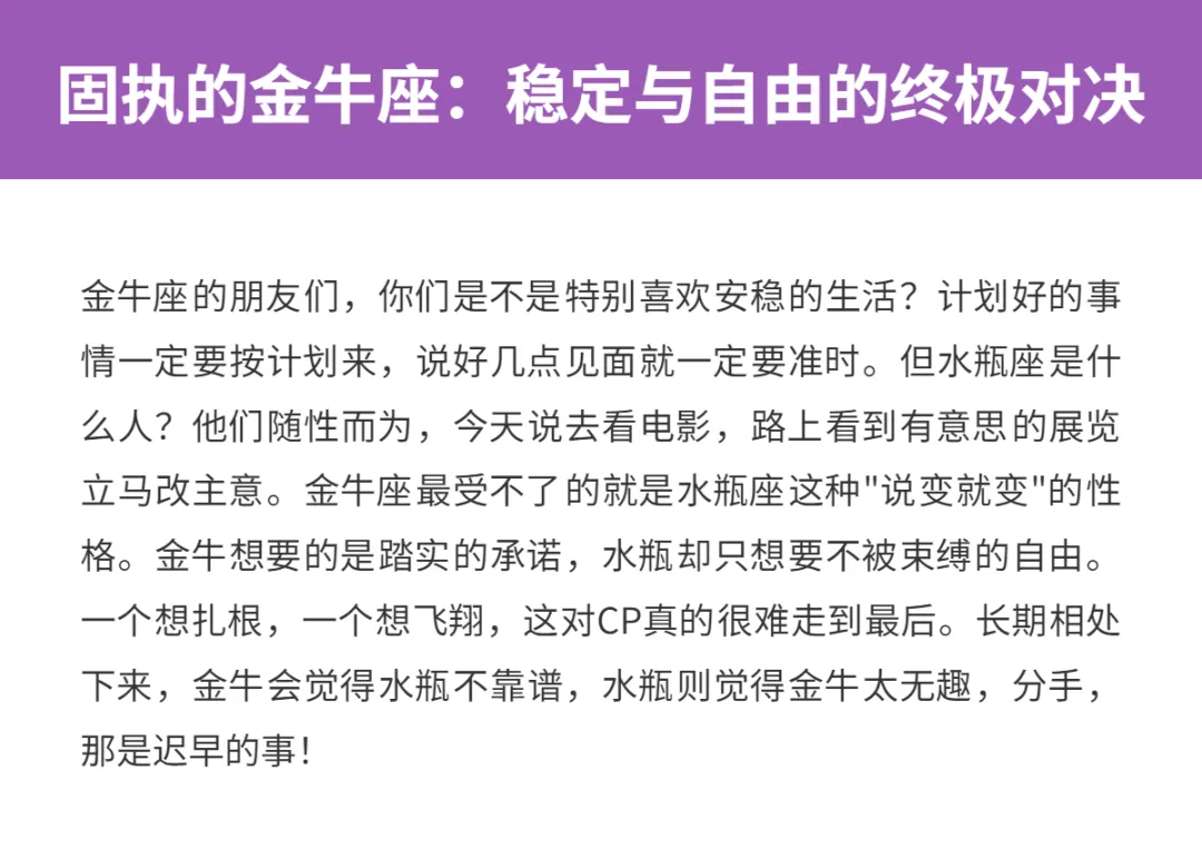 水瓶座的人总是给人一种神秘又特立独行的感觉,他们思维跳跃,追求自由,对待感情也是独具一格。但并不是所有星座都能适应水瓶座这种"我行我素"的恋爱方式。有些星座和水瓶座在一起,简直就是一场注定失败的修行!今天就和大家聊聊,哪些星座和水瓶座谈恋爱基本上是在"刚在一起就准备分手"的节奏。别怪我没提醒你,如果你是这几个星座,遇到水瓶座还是先考虑考虑吧!