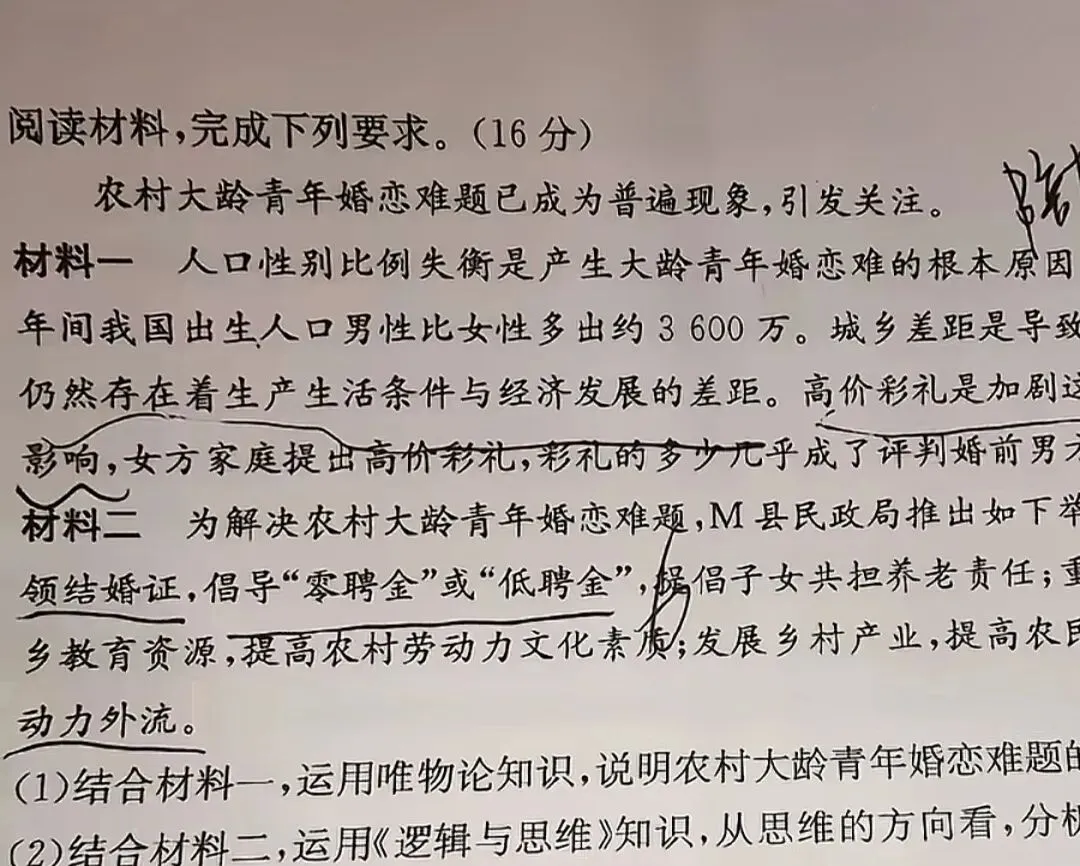近日,一场关于“农村大龄男女婚恋难题”的九师联考政治考题,在社交媒体上掀起轩然大波。