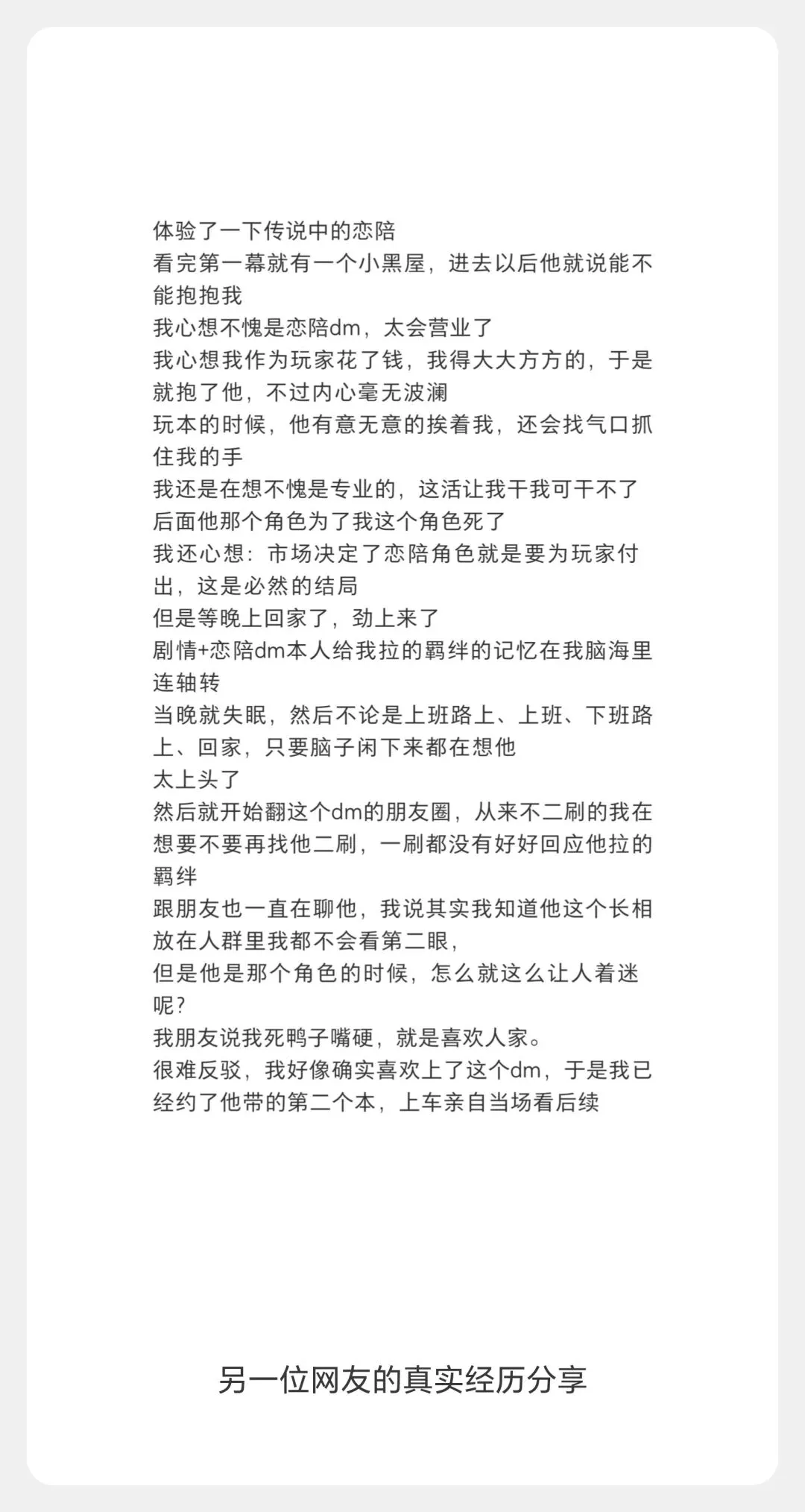 从正面来看,它是情绪的慰藉与自我的探索。不可否认,恋陪DM的存在有着积极意义。