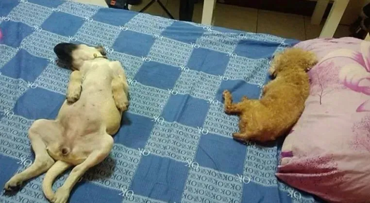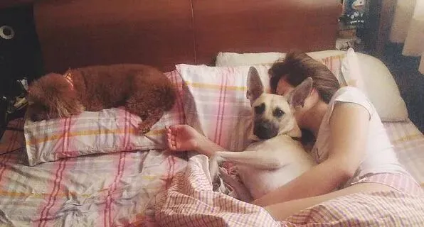 上个厕所回来 , 床没了 , 女朋友也没了 , 全被两只贵宾给占了!