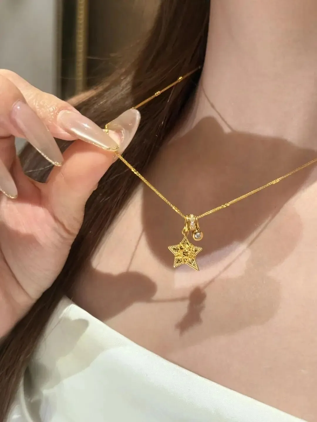 清晨洗完脸的时候灯光微微刺眼我习惯性地在镜子前戴回平时的素链结果房间安静到能听到自己指尖碰到金项链的细微摩擦感这次不是那种光面无花的老款而是新挑的星星吊坠链刚好赶上了她生日前夕也是我第一次买这种带点特殊设计的