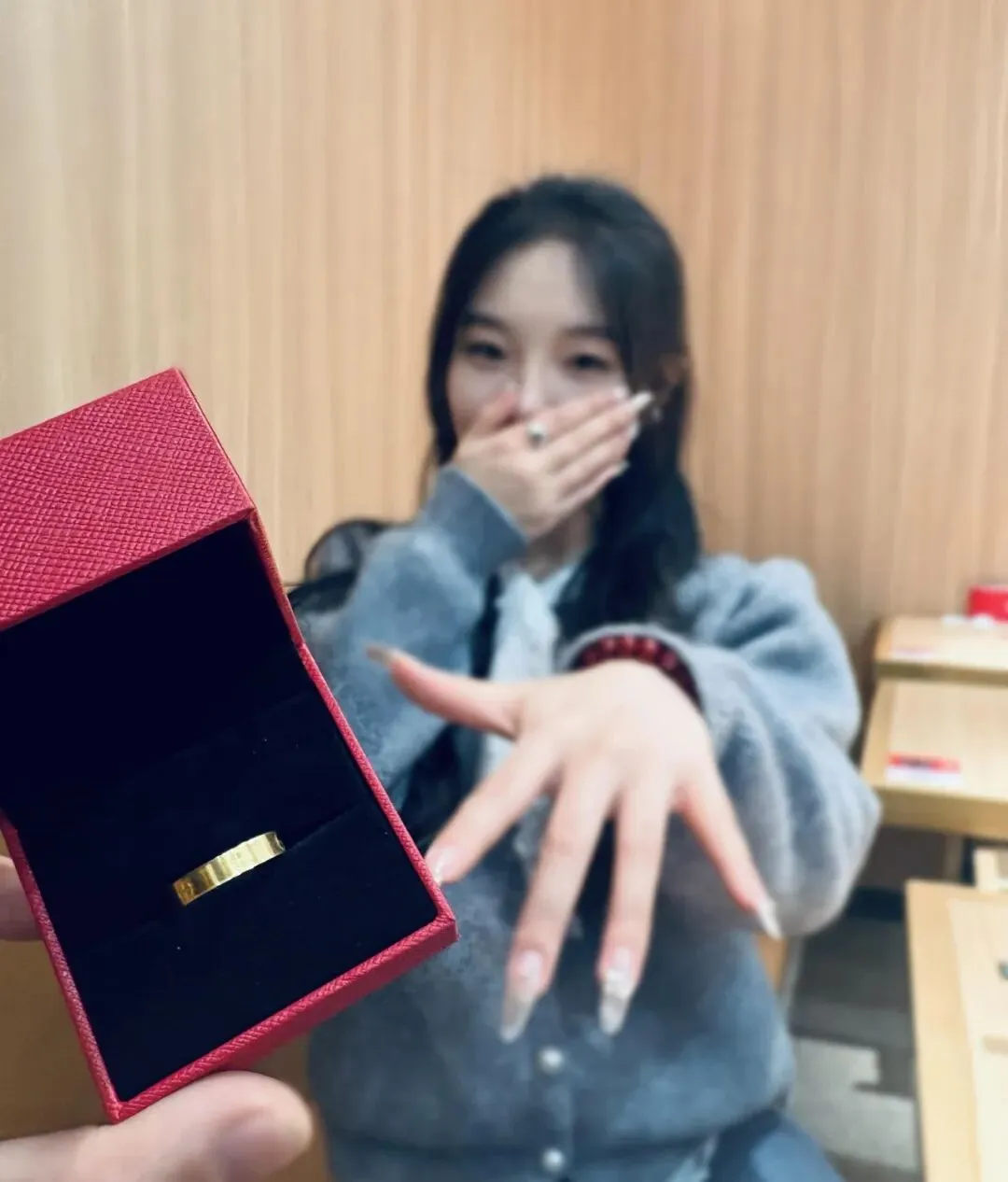 冬天的空调热风吹在脸上会有点干 我刚摘完手套 手心里还残留着洗手液的香味 这两天本来就有点小烦躁 没想到这枚新金戒指直接把家里气氛推向巅峰(无语)