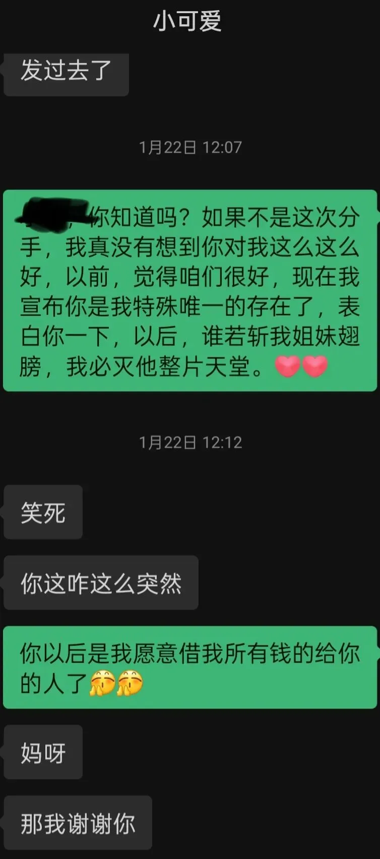 等我情绪平稳回来上班后,我给小可爱发了这样的一段话,虽然感觉有点杀马特。但是,发自肺腑,小可爱,你在我心里永远都是第一顺位,我愿永远站在你这边。虽然我总说你是恋爱脑,但是还是希望你能找到如意郎君的哦。