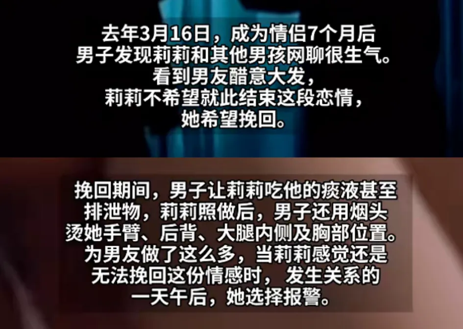 所以拿分手当筹码,逼着女孩干了一系列非人且恶习的行为,比如扇耳光、用烟头烫身体等。