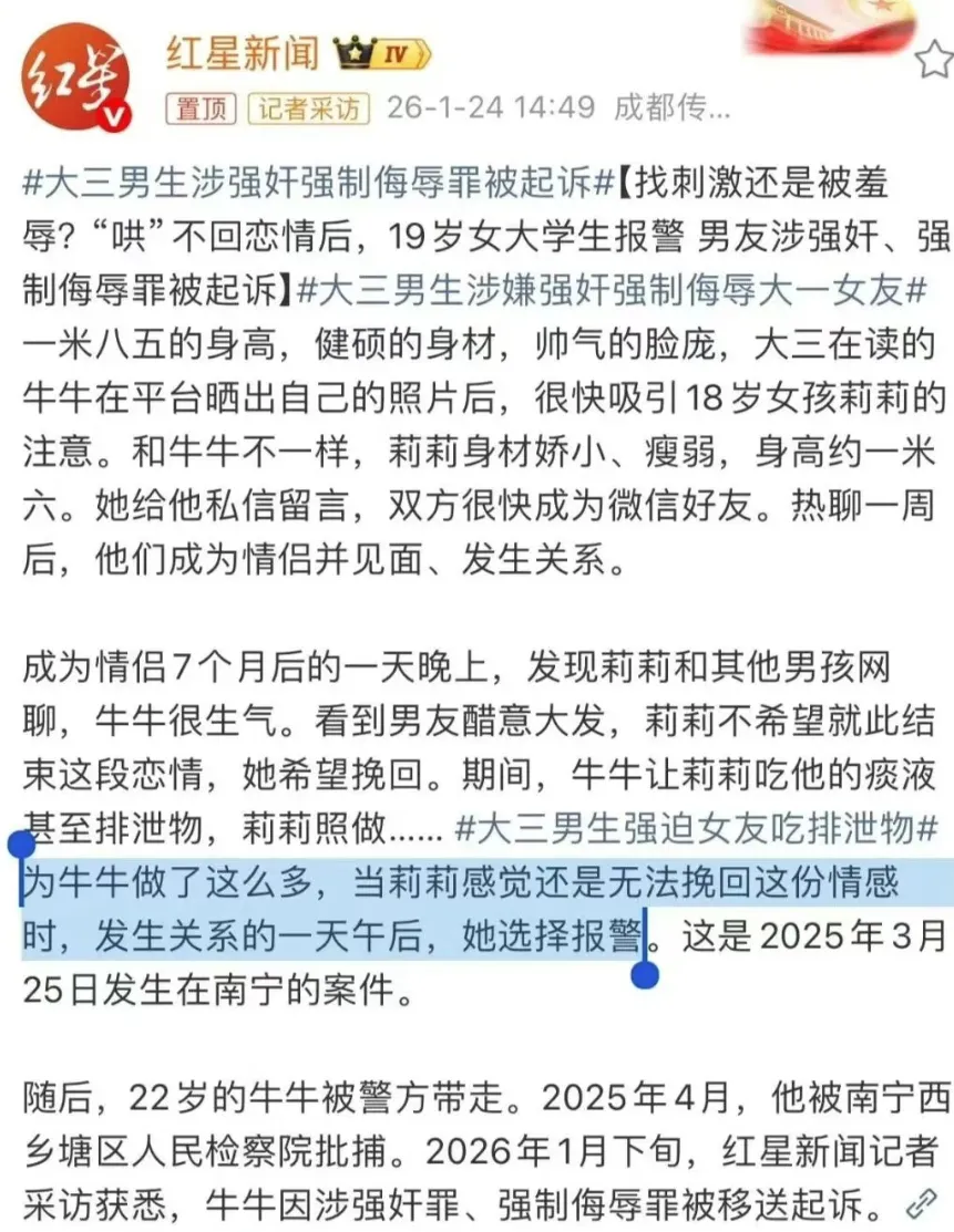 2025年12月,检察院不仅以强奸罪起诉牛牛,还追加了强制侮辱罪的指控,2026年1月下旬,案件被正式移交至法院待审!