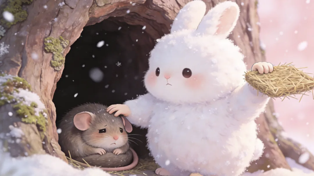 点点犹豫了一下,还是打开了门。雪兔团团顶着一身雪,耳朵上挂着冰晶,看到点点红红的眼睛和地上的碎片,立刻明白了发生什么。但他没有责备,反而从怀里掏出一块柔软的干草垫:“先把脚垫上,别再划伤了。”