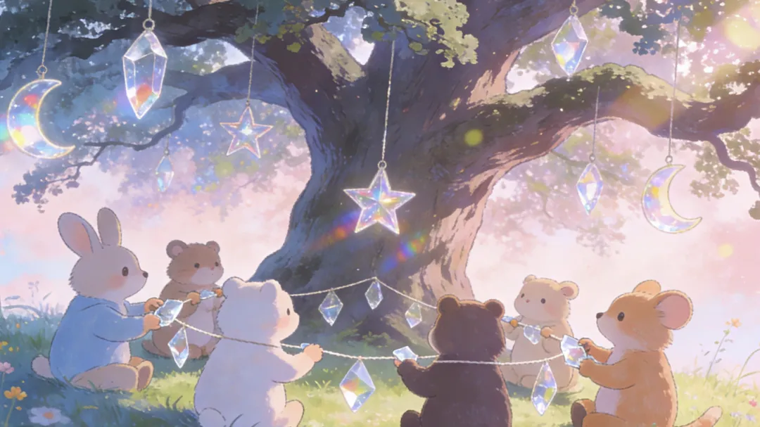 大家围坐在一起,松鼠爸爸教点点把玻璃碎片小心地嵌进树脂里,再放上捣碎的浆果,做成了一个个小小的挂饰。团团帮忙收集柔软的干草,编成挂绳;莱西用爪子把挂饰打磨得光滑圆润;小羽则在挂饰上唱起轻柔的歌,让每一个挂饰都染上温柔的旋律。