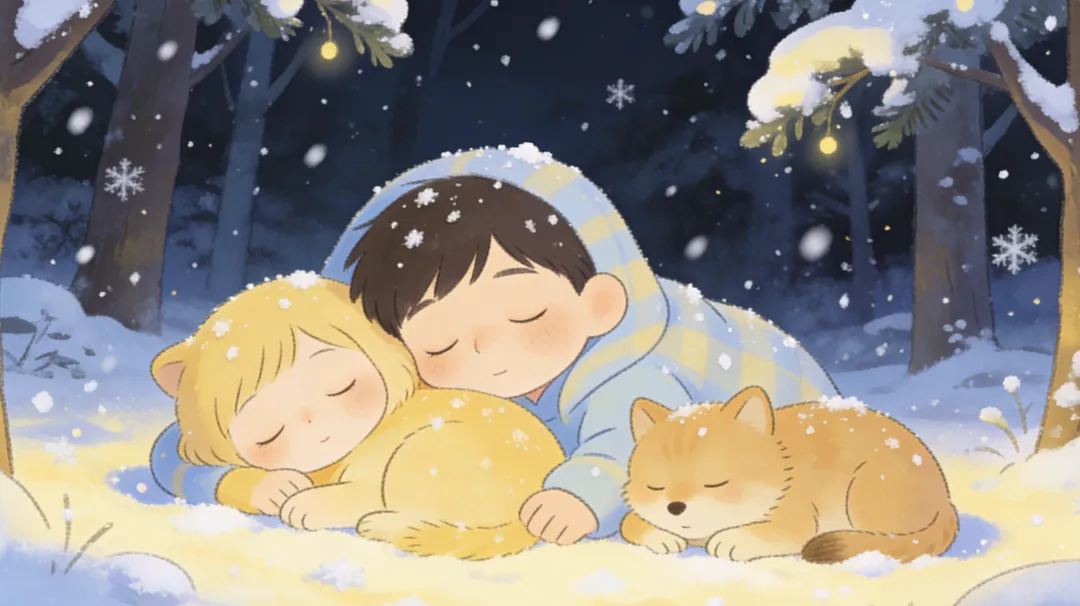 而现实里,松针森林的冬夜依旧宁静,雪花轻轻飘落,盖在熟睡的点点身上,像一床温暖的被子。挂在橡树上的玻璃星,在月光下闪烁着,守护着这个曾经内疚的小家伙,也守护着每一个愿意接纳不完美的温柔灵魂。