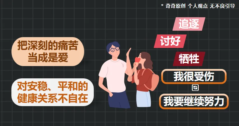 重复的在“我很受伤”,和“我要继续努力中”跌倒又爬起,把这种深刻的痛苦当成是爱,反而对安稳、平和的健康关系感到不自在。