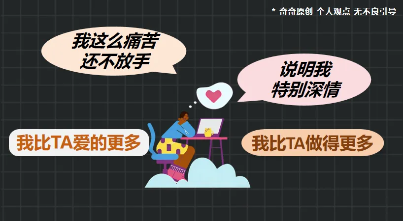 比如,你会觉得“我这么痛苦还不放手,说明我特别深情”,沉迷于“我比他爱的很多,我比他做的更多”的自我满足里。