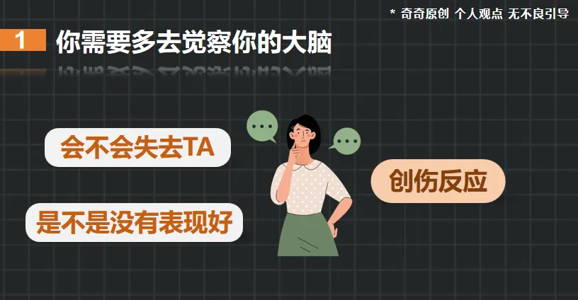 以上这些反应都是创伤反应,所以在这个时候,你要清晰地给当下的情绪贴标签,比如:我现在的难过,是因为我很恐惧、我现在的执着,是因为求而不得的不甘心在驱动。