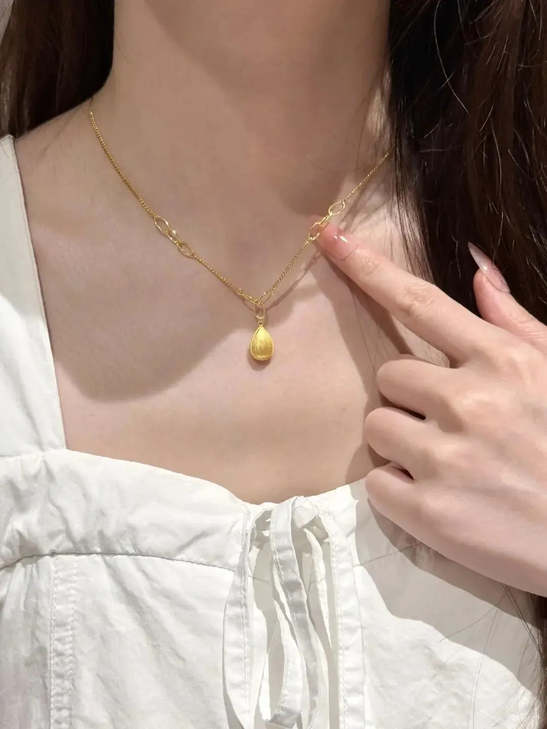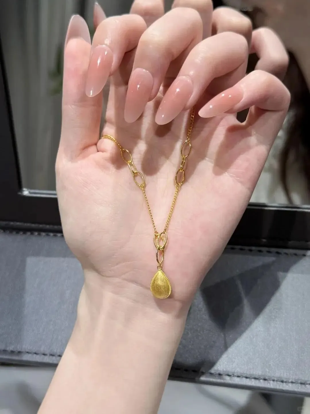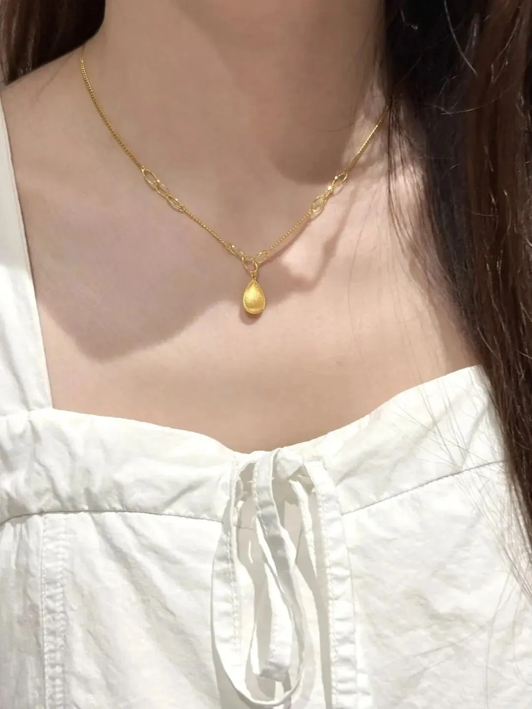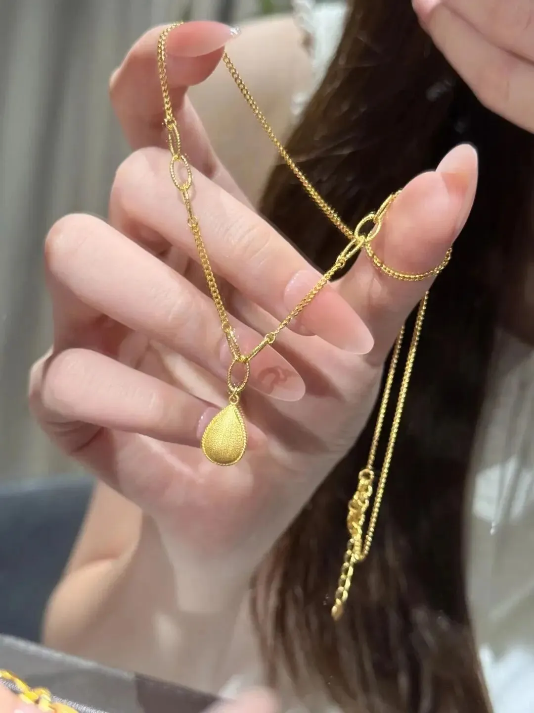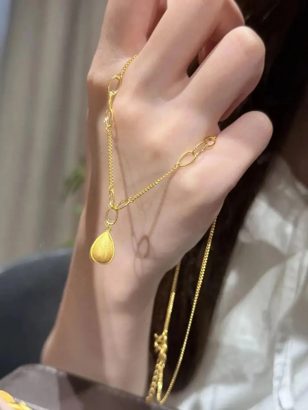 午休时摸出手机又刷了一遍那些热门首饰推荐 她一直喜欢简简单单又有点心思的款 前几天逛到这条小水滴金项链 净重3克 是光沙面工艺 细链搭配小泪滴吊坠 有点韩味但不会太轻佻 是那种日常穿衬衣毛衣都能hold住的感觉 我那会还特地问了工费 说实话还是有些小贵 单看料要1300一克 工费每克再加用下来的会员卡抵了几十等于还算划算但加起来总价还是接近4800(松口气)这已经能顶我一张健身年卡了~