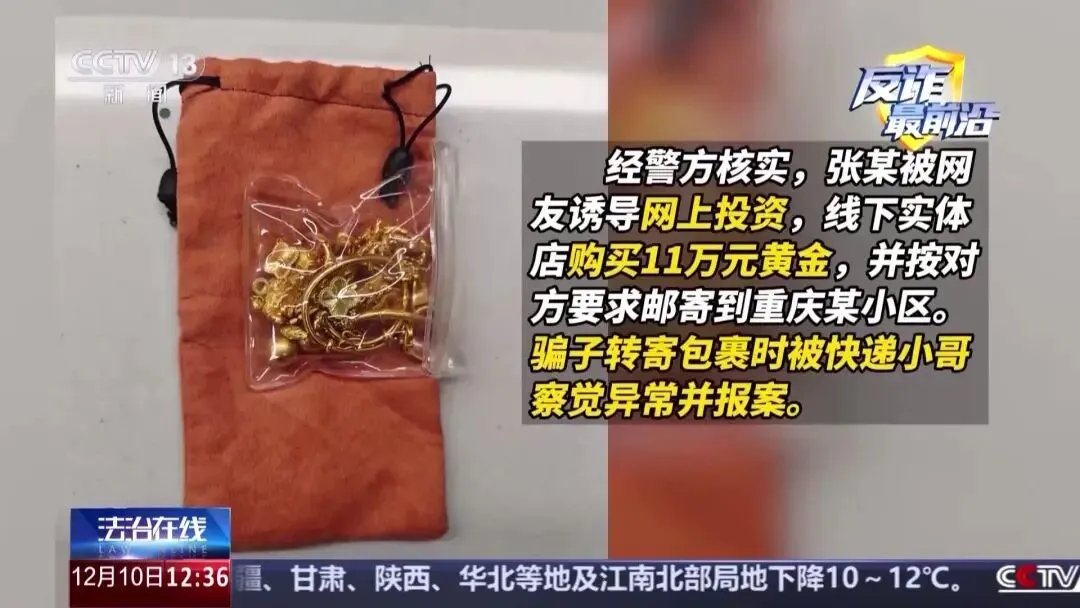 经警方核实,张某被网友诱导网上投资后,在线下实体店购买了11万元黄金,并按对方要求邮寄到重庆某小区。骗子转寄包裹时被快递小哥察觉异常并报案。