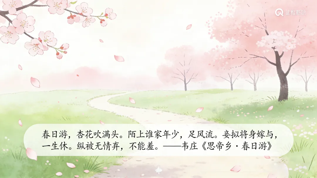 这词的大概意思是,一位姑娘春日郊游,杏花随风飘落,缀在她的头发上。你看多惬意、浪漫的场景。