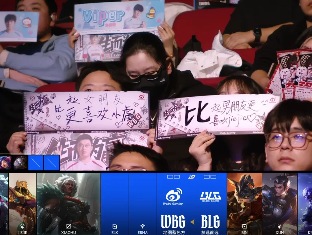 WBG对阵BLG,现场有两位粉丝举牌: