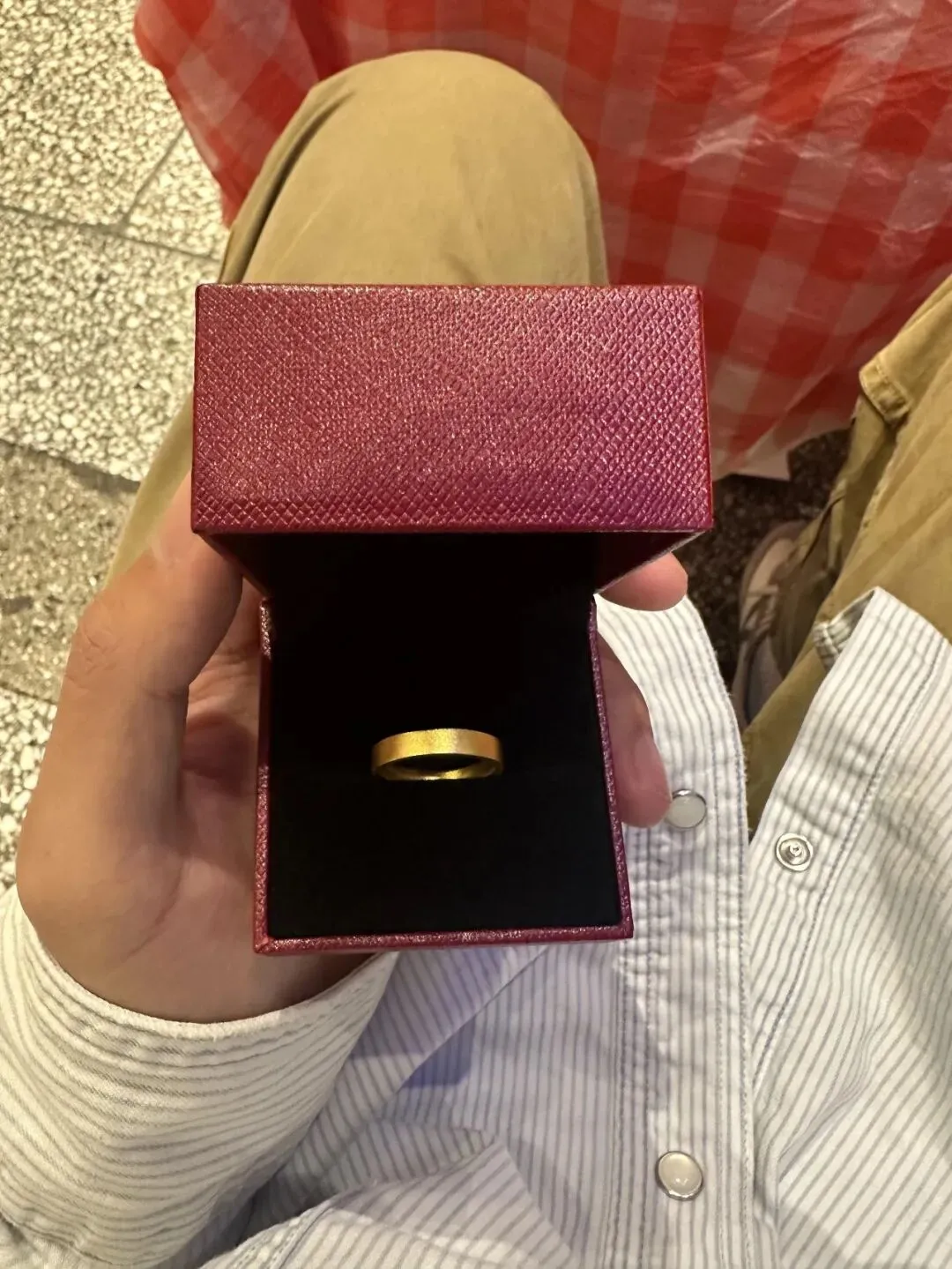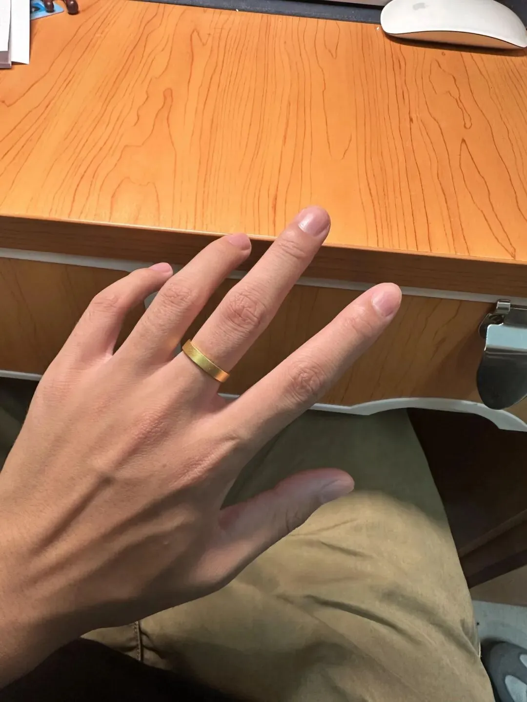 前天刚到家 男朋友就神秘兮兮塞了个红盒子给我 我还以为是什么奇奇怪怪的小玩意 打开一看是金色哑光工艺的戒指 没有雕花 也不是什么浮夸造型 只有简单一圈金 属实的那种 老实说最开始我有点懵 戒指的克重其实不算很大 单只大概在3-4克区间 金价那段时间在每克570上下 工费倒没多少 只比基础金价多出一杯咖啡的钱 有点不可思议的是 这个戒指戴在手上 比我想象得还要厚重 可能是我指节偏细吧 戒轮有点宽 面积感一下子被拉满