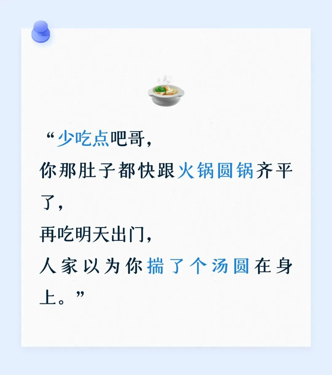 “少吃点吧哥,你那肚子都快跟火锅圆锅齐平了,再吃明天出门,人家以为你揣了个汤圆在身上。”