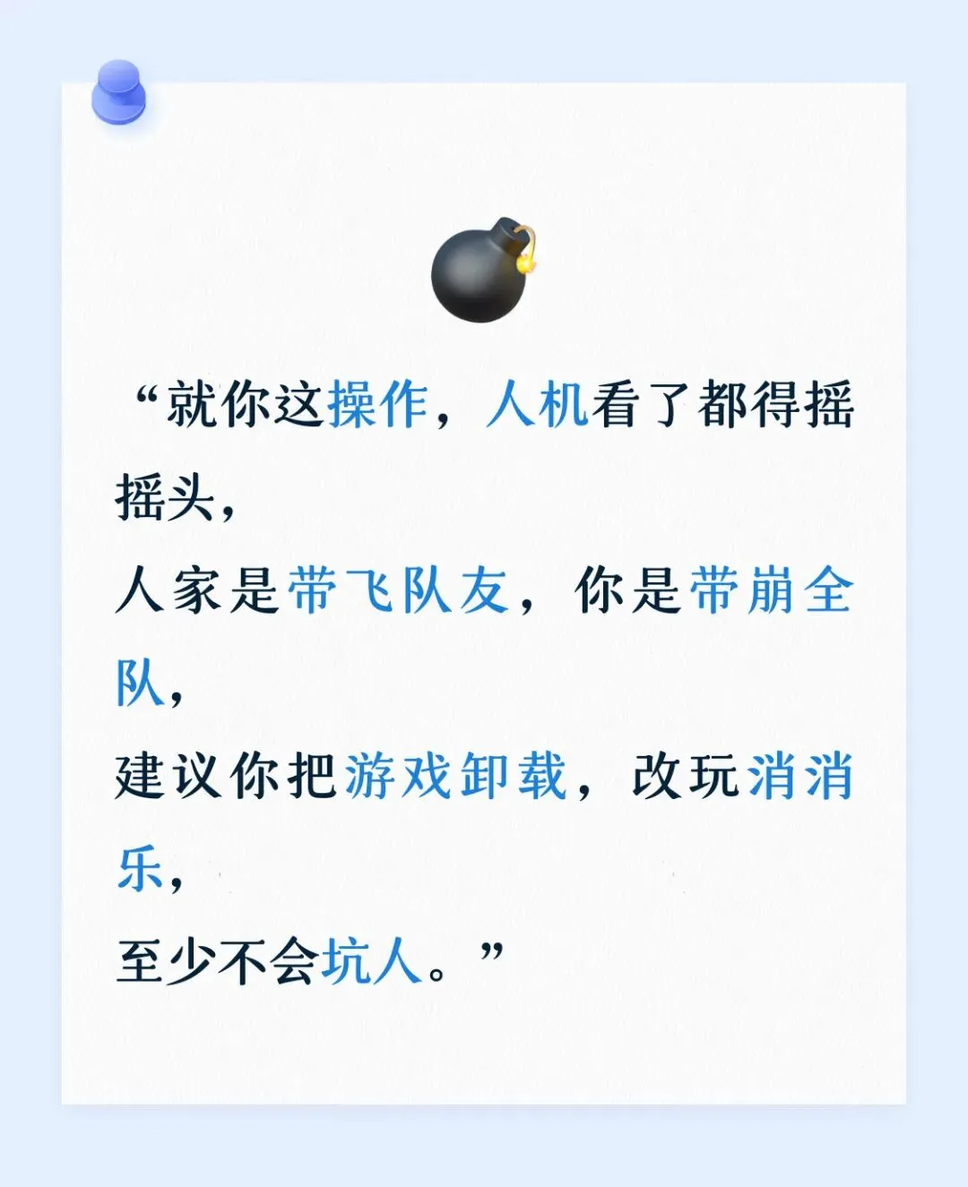 “就你这操作,人机看了都得摇摇头,人家是带飞队友,你是带崩全队,建议你把游戏卸载,改玩消消乐,至少不会坑人。”