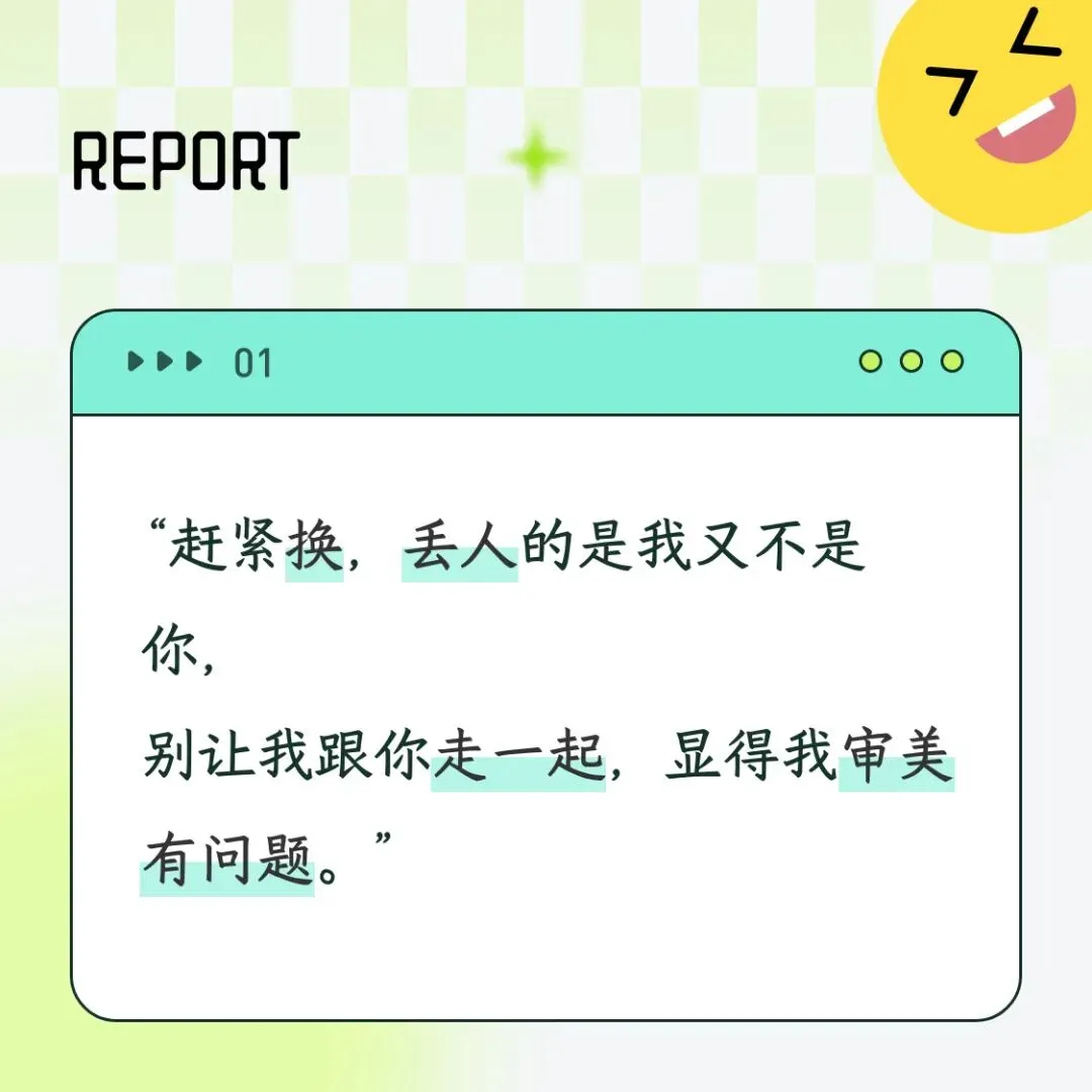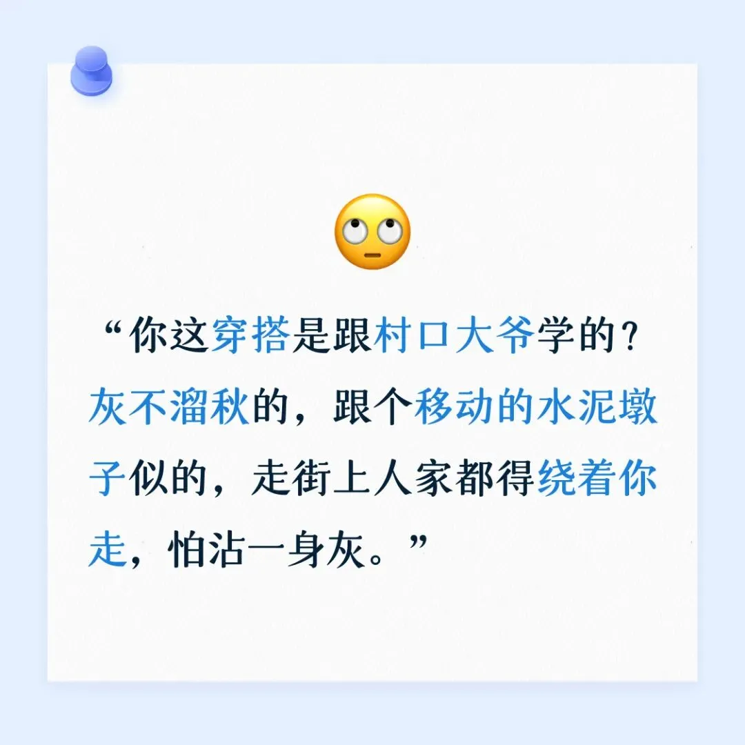 “你这穿搭是跟村口大爷学的?灰不溜秋的,跟个移动的水泥墩子似的,走街上人家都得绕着你走,怕沾一身灰。”