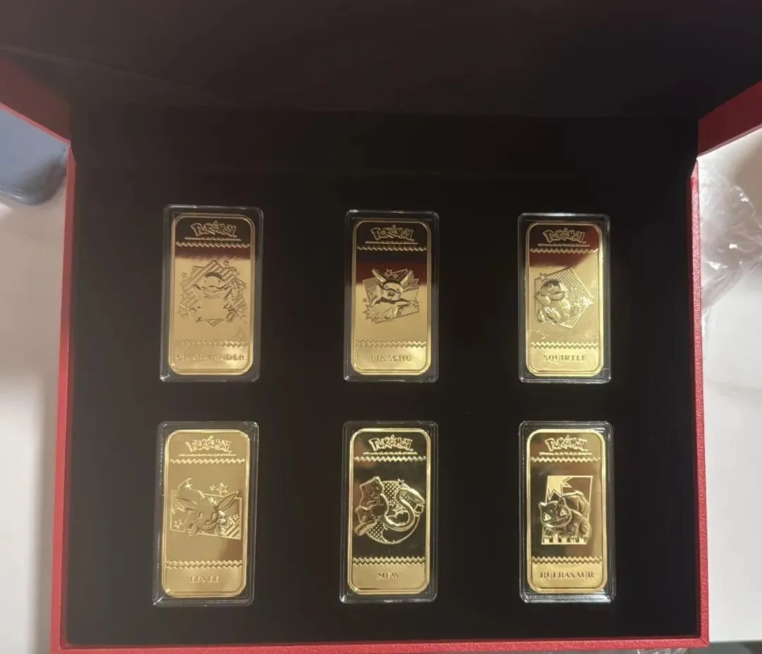 打开包装一秒穿越小学午后时光,好几个经典形象都在金条上,皮卡丘、小火龙、杰尼龟、妙蛙种子、伊布还有梦幻,而且都是浮雕,反光的时候整个房间都跟着亮了一下,很搞笑,盒子边上我刚撕那个透明塑料膜结果指甲还崩了一个小口子,痛感比拆快递还扎实…