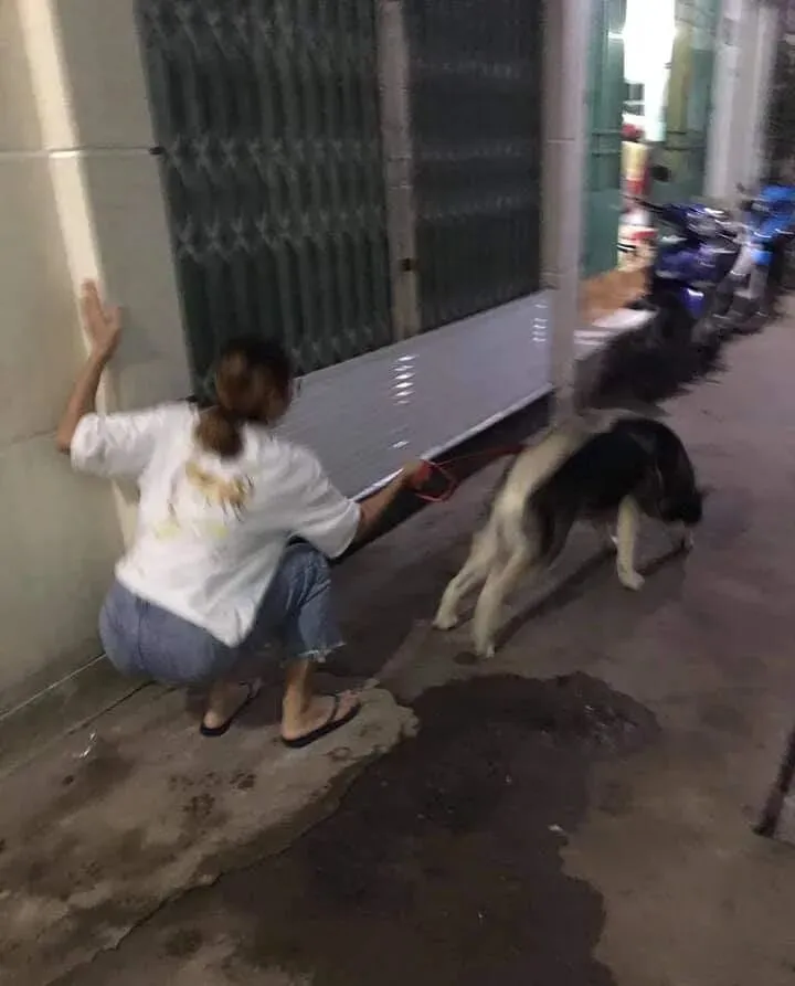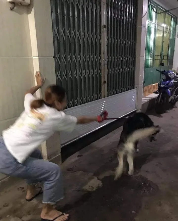 这狗跑起来根本拉不住 , 小姐姐只能扶着墙借力 ,