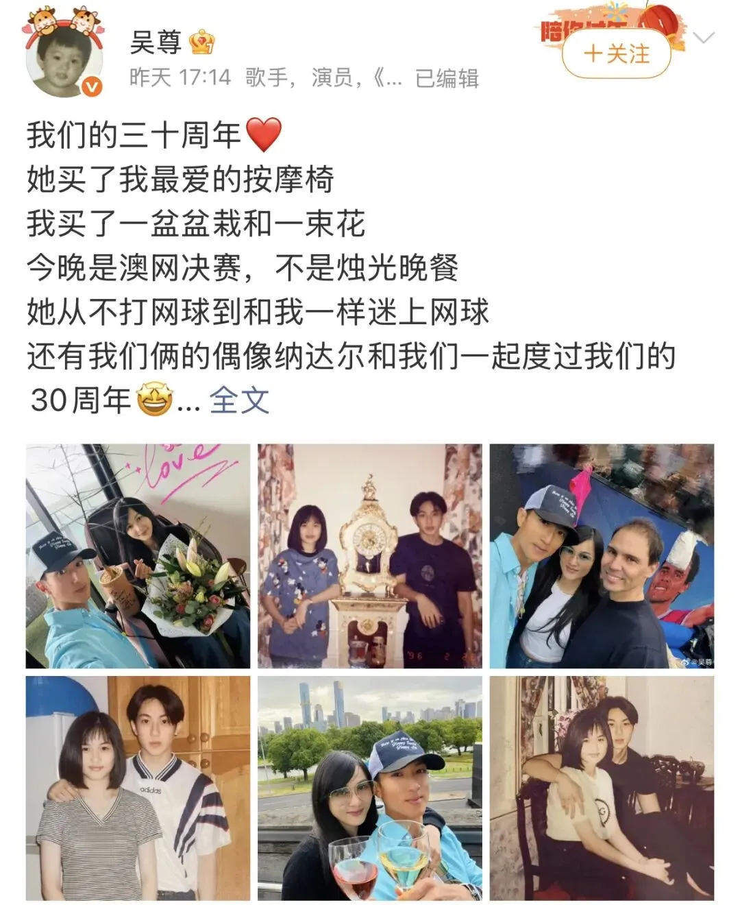 2026年2月1日,吴尊在社交平台发文庆祝与妻子林丽吟相恋30周年,两人晒出青涩恋爱旧照并分享在澳洲观看澳网决赛的日常,引发网友对这段"偶像剧爱情"的热议。