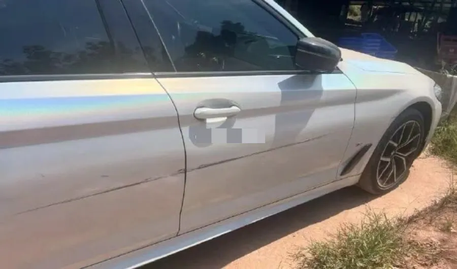 车的侧面刮了长长的一条,底漆都被刮了出来。