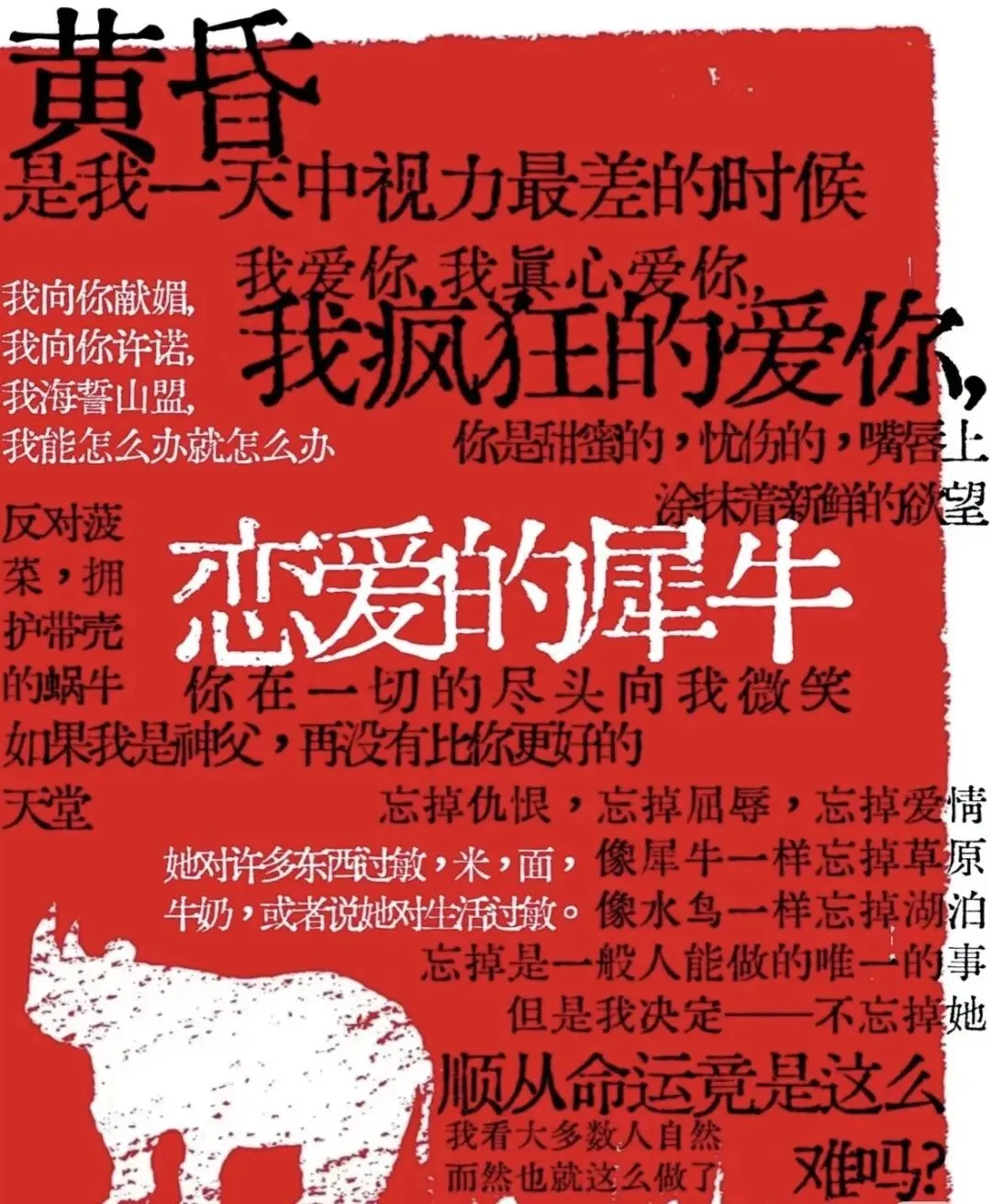 《恋爱的犀牛》是中国先锋戏剧导演孟京辉与编剧廖一梅于1999年创作并首演的话剧,被许多人奉为“永远的爱情圣经”。它讲述了一个极致偏执的爱情故事,已成为中国演出场次最多、影响最深远的舞台剧之一。