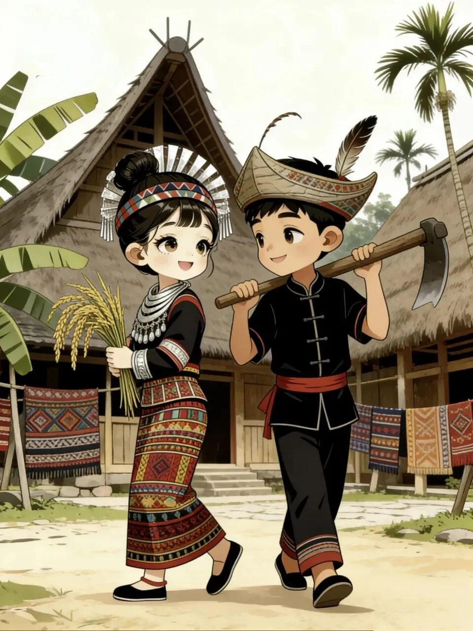 台风季来临时,阿明和阿雅守在田埂上,用椰树叶把稻穗扎成捆,防止被风雨吹倒。雨水打湿了阿雅的纹面,阿明伸手替她擦去水珠,指尖触到蝶翼纹的印记时,他想起初见那天,椰树下的姑娘正低头织锦,阳光穿过她的发梢,在纹面上落下细碎的光斑。