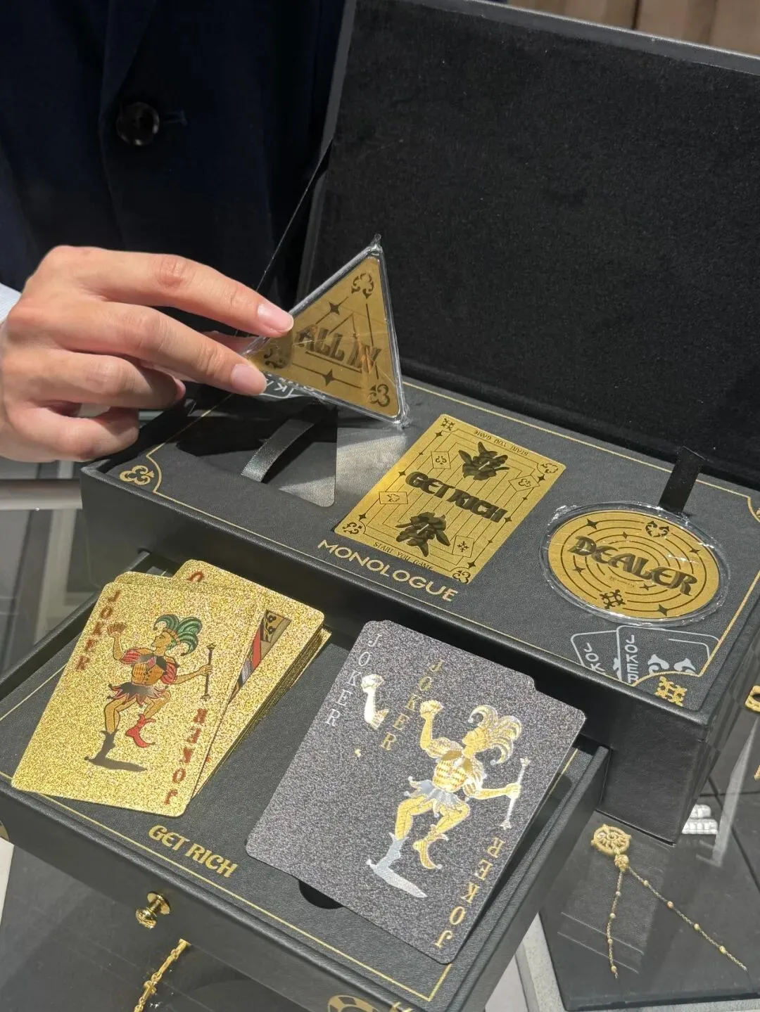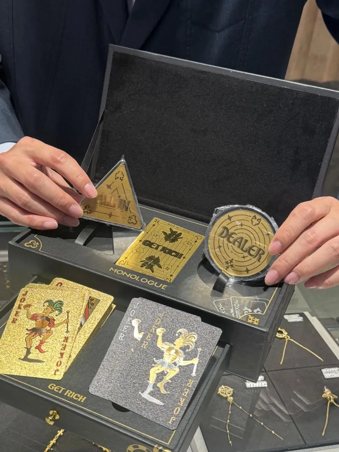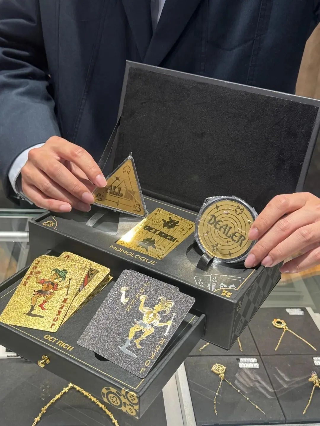 隔着手机屏幕都能看出我对黄金首饰的热情 但要不是亲历这件事 我还真没意识到 家里对黄金的执念原来这么深 说出来你可能不信 上周我生日 男朋友直接送了一副黄金扑克牌 礼盒一打开亮到我眼都眨了三下 手还碰到了一下透明罩边角 细细刺刺的 那种微妙的滑腻感一下让我清醒过来 这不是普通首饰 是纯金打造的三组扑克 还有筹码和三角标啥的 全都镀成金灿灿的牌面