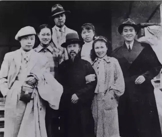 出发前,在梵航(皇)渡车站前合影左起:顾而已杜小鹃唐纳沈钧儒蓝苹叶露茜赵丹