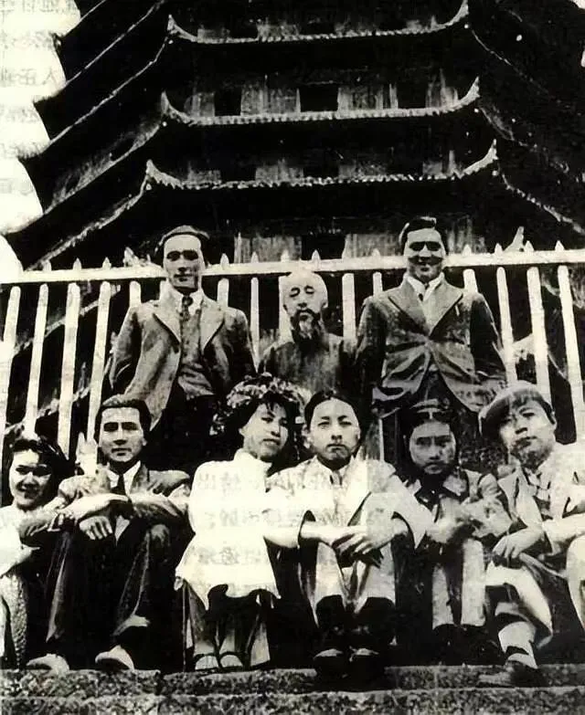 后排左起:郑君里 沈钧儒 李清;前排左起:叶露茜赵丹 蓝苹唐纳 杜小娟 顾而已