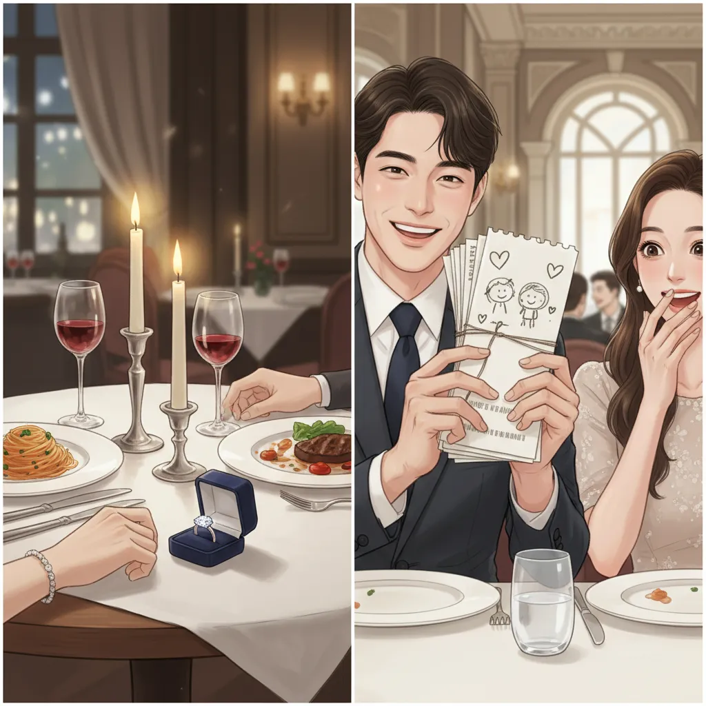 烛光晚餐,深情对视,他从西装内袋掏出精致的钻戒盒。
