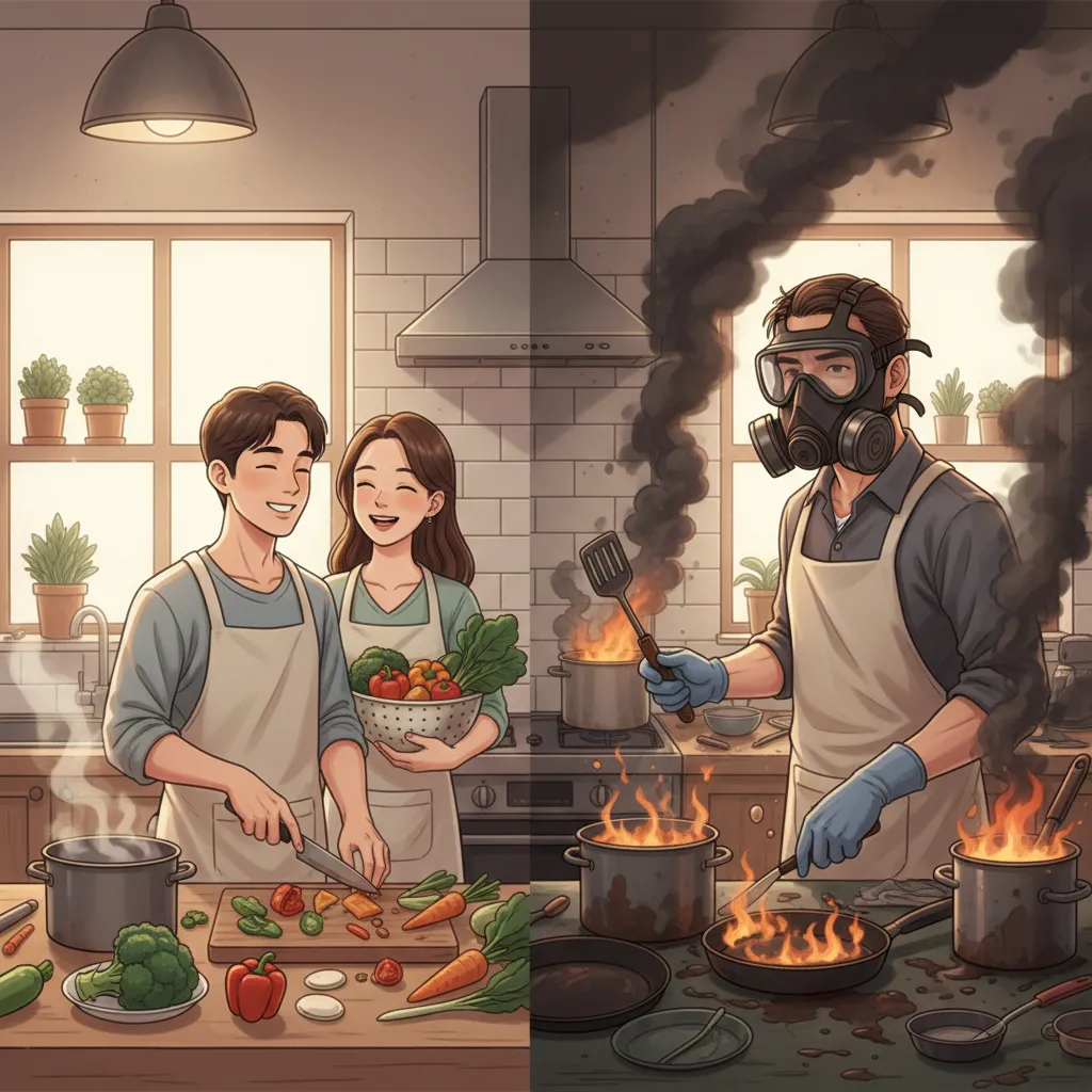 他戴着全罩式防毒面具和电焊手套,像在搞核物理实验一样炸厨房,并声称这叫“工业级硬核烹饪法”。