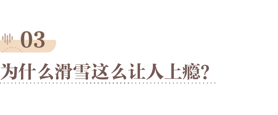 那种人类最纯粹、原始的生命感受,没有人能够轻易抗拒。但认真学过滑雪的人,才真正会懂的那些穿着雪服拖着一大包滑雪装备的人坚持的是什么。从一开始的磕磕巴巴到驾驭越来越陡的雪坡,逐渐学会各式的跳跃、回转动作的进阶过程,最令人难忘。就算伤痛和挫败从未缺席,但当在雪地或是空中划出漂亮的一个弧线时,那种喷薄而出的喜悦用任何语言都难以形容。一点点征服雪坡、突破自我的成就感,是滑雪让人上瘾的原因之一。当然,也有一些人,没那么追求专业、疾驰、花哨,只是抱着“玩一玩”的心态来到雪场。在白茫茫的雪地中,他们因为过于寒冷,不必掏出手机回复各种繁琐的工作消息。毕竟,实在滑不动,还可以一屁股坐在雪板上,一边手动滑雪一边欣赏风景。有一句话或许可以回答这个问题,也足够囊括所有滑雪爱好者的心情——