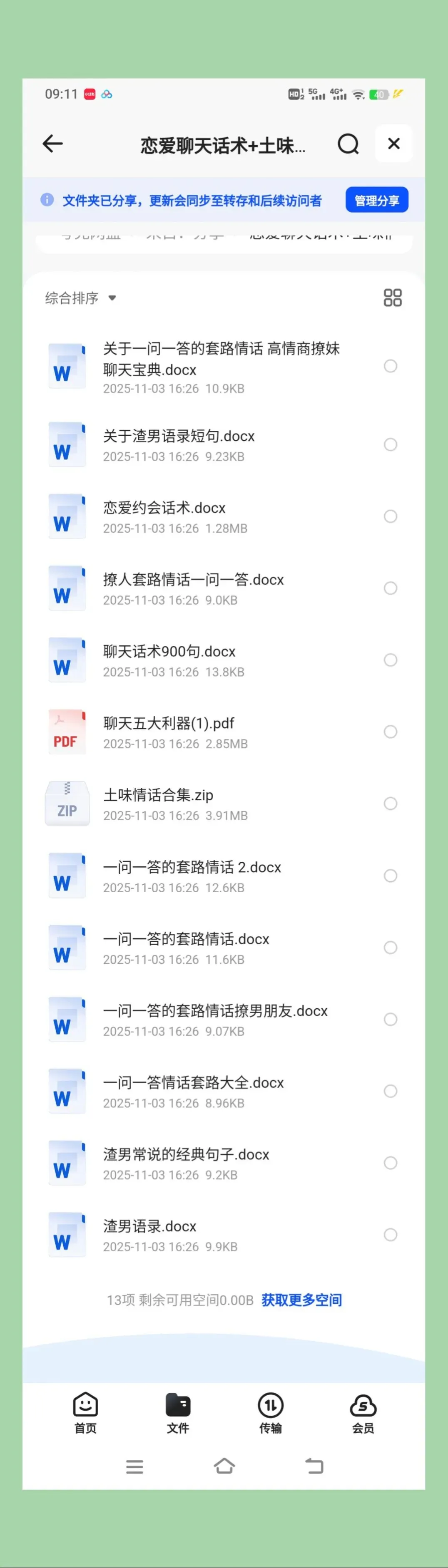 里面塞了13个文件,什么《渣男语录合集.docx》《高情商回复模板.pdf》《土味情话宝典.zip》……格式从文档到压缩包全齐活。