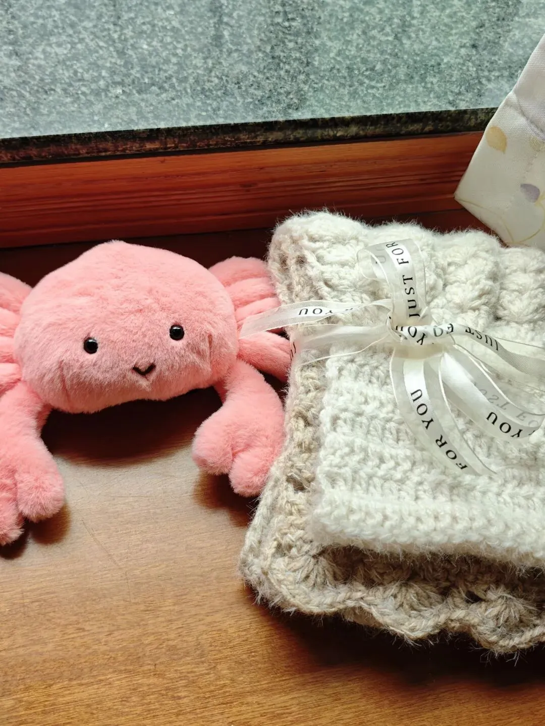 w姐给我织了一个围巾,超喜欢,钩织大王已经给我织了两个耳机包、一条围巾、两个包包了,她太厉害了。