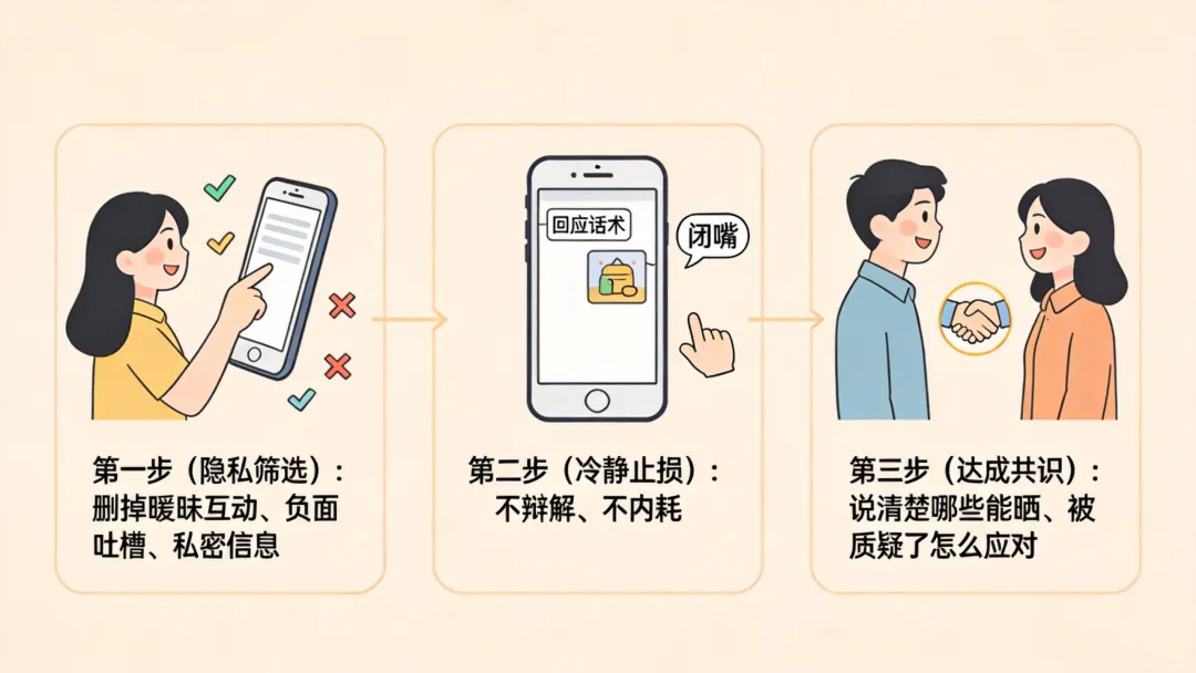 你有没有过这种经历?婚前满心欢喜晒自己的喜事,转头就被网友翻出老底,前一秒还被人祝福,下一秒就被骂得狗血淋头。最近#武汉姑娘晒18万彩礼被翻出外籍聊天# 这事儿,刷爆了小红书和抖音,才4天时间,评论区就破了12万,有人骂她“一边收人家彩礼,一边跟别的男人暧昧”,也有人替她说话“就是普通社交而已,网友也太能脑补了”。其实这场闹剧,藏着咱们20-40岁女生搞对象、结婚时,最容易踩的坑——总想着晒幸福,却忘了给自己的隐私,留条后路。这事说起来也挺简单的:武汉有个姑娘,在小红书上晒了红纸包着的18万彩礼,配文还透着一股要当贤妻良母的劲儿,顺带提了一嘴,男方家还出了72万的婚房首付,一开始评论区全是祝福的话。可谁能想到,第二天就有网友,把她半年前的Instagram聊天截图翻出来了——有个外国男生发消息问她“Want to hang out?”(意思就是约着出去玩),她就回了个笑脸。就这一个简单的回复,直接炸锅了,大家把“收彩礼”和“回笑脸”绑在一起瞎解读,还有人直接扣上“骗婚”的帽子。姑娘没办法,只能删了动态、改了简介,而男方那边,前一天还在朋友圈晒婚房装修的进度,这下也被拖累得很被动,本来挺喜庆的事,最后闹得一地鸡毛。其实这个事情的关键,根本不是“回个笑脸算不算暧昧”,说白了就是咱们都觉得在朋友圈“晒晒幸福”、不藏着掖着,是一件很平常的事情,可压根没有意识到,这事,本质上就是把自己放在所有人面前,让人评头论足,以前留下的任何社交痕迹,都可能被人翻出来,当成评判你人品的一把尺子。更让人心里不是滋味的是,那些看热闹的人,根本不是在评理,而是在盘算“男方付出了这么多,女方就该做到十全十美”。就这种简单的付出换回报的想法,让很多女生,不知不觉就成了别人嘴里的“笑柄”。很多女生应该都有过类似的经历吧:谈恋爱的时候,晒个牵手合照,分手之后被人翻出来调侃;结婚前晒彩礼、晒婚房,结果被人扒出以前的社交动态,鸡蛋里挑骨头;甚至有时候,就发一条开心的日常,都有可能被人过度解读,引来一堆没必要的争论。咱们总觉得,自己就是记录下生活而已,可别忘了,网络是有记忆的,那些你觉得无关紧要的聊天、随手发的动态,在某些时候,都可能变成自己给自己挖的“坑”。借着这事,我给大家整理了3个超实用的婚恋隐私保护方法,还有能直接复制粘贴的聊天话术,帮你避开这种坑,既能大胆发朋友圈晒幸福,也能护好自己的隐私,这也是《两性关系经营实操手册》里,最实用的情感风险应对技巧,看到这里,你是不是忘记点赞了?打开你所有的社交软件——微信、小红书、Instagram、抖音这些,筛选一下近一年的动态和聊天记录,删掉或者隐藏3类内容就好:- 第一类,和异性的模糊互动,比如那些有点暧昧的调侃、别的男人约你单独出去玩,你给的模糊回应;