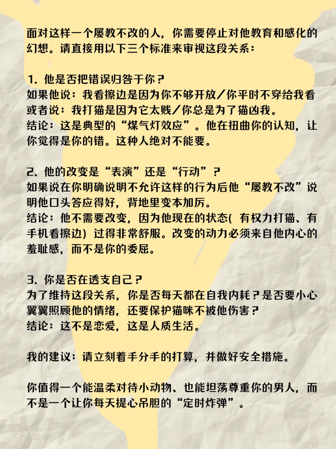 亲爱的你,如果说男友"沉迷擦边且无视你的感受",暴露的是他关系模式中 “冷” 的一面(边界模糊、尊重缺失),那么"粗鲁的对待猫咪"则暴露了他性格中 "恶"的一面(缺乏共情、暴力代偿)。