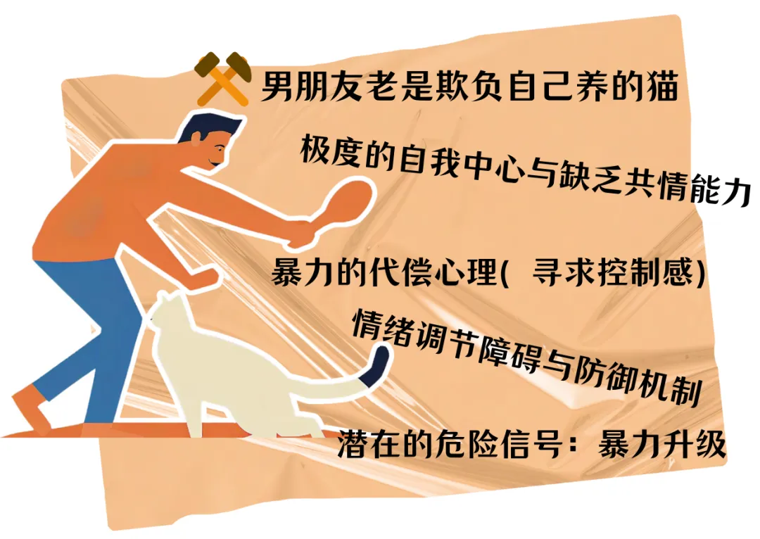 升级版: 当你因为猫而指责他时,他通过进一步虐待猫(比如当着你的面摔猫),实际上是在"惩罚你"。这是一种极其恶劣的"三角关系"处理方式,他把猫当成了争夺家庭主导权的工具。