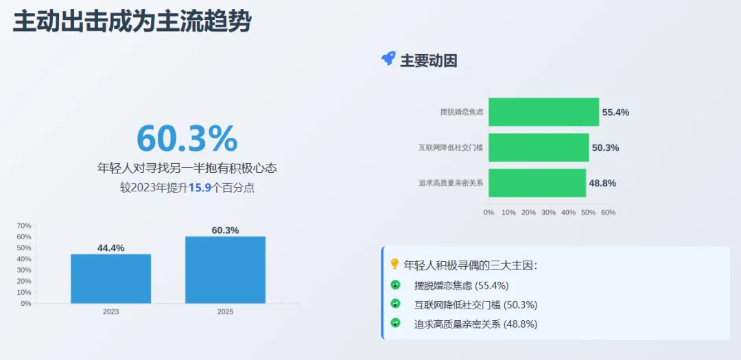 2025年调查显示,60.3%的年轻人对寻找另一半抱有积极心态,较2023年提升15.9个百分点。