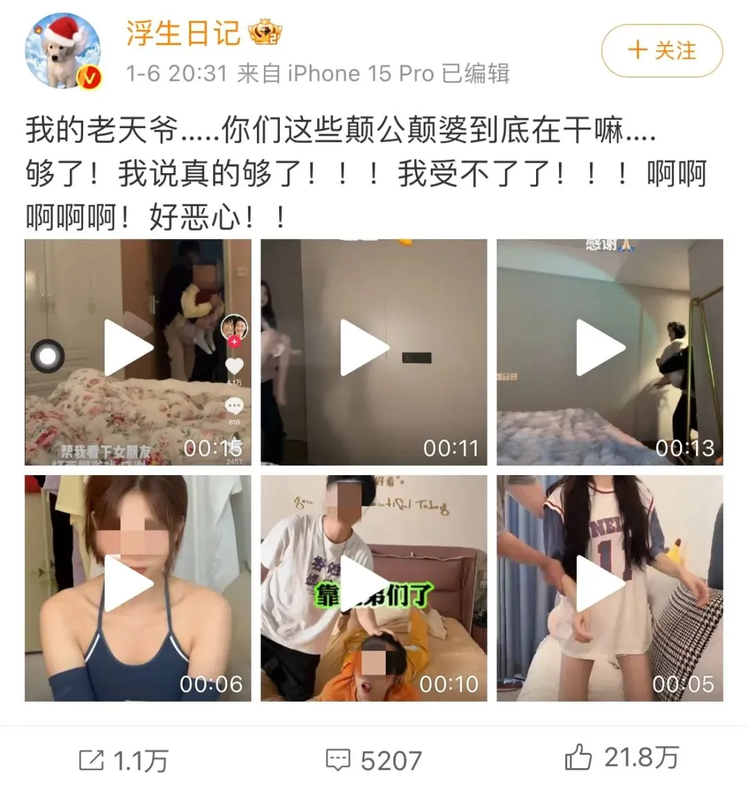 ......................................................................最近,有这样一则帖子火上了热搜,让人看得直皱眉头。男朋友用一种给小孩把尿的姿势,抱着自己的女朋友进了房间。然后随意地将她扔到床上,让她瞪着无辜的双眼看着镜头,摆出楚楚可怜的模样。为了显示自己的天真可爱,有的翘起了自己的脚,有的则喝起了牛奶。而男友通常会朝着镜头鞠一躬,之后匆匆离开,文案往往是这样的:“帮我看一下女朋友,我去打两把游戏,晋级赛,辛苦了!”“家人们帮我看下我老婆,总是要粘着我,烦死了,感谢兄弟们。”更露骨点的,甚至在视频里配上了这样的花字:“你愿意照顾她么?”不出所料,视频下面的评论区里,画风常常是不堪入目的:而这个“帮我看一下XX”的梗原先根本不是这样用的,是一些母婴或宠物博主用来晒娃、晒宠物的。“帮我看一下XX”,用在没有自理能力的小宝宝和宠物身上,是挺贴切的。可用在一个成年女性身上,一下子就变了味,让人能解读出无数种浮想联翩的意思。“这个梗用在小狗小猫和乖乖的小孩还挺可爱的,可这是在干嘛?”“有时候分不清你们是真弱智,还是玩梗,反正挺傻X的。”“这都不是娇不娇妻的问题了,这都已经不把女朋友当人了。”网友们到底犯了什么错,又变成了这些博眼球的情侣们play的一环。而更令人难以理解的是,这还不是个例,现在这种“将成年人矮化幼化物化”的趋势,简直是愈演愈烈。......................................................................