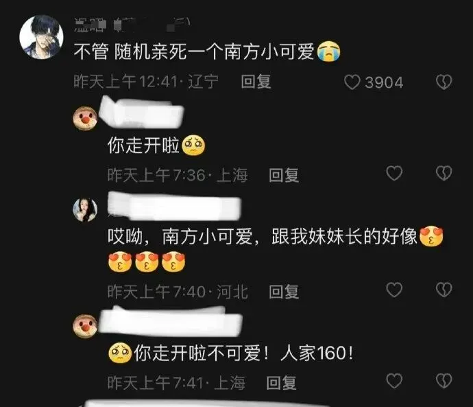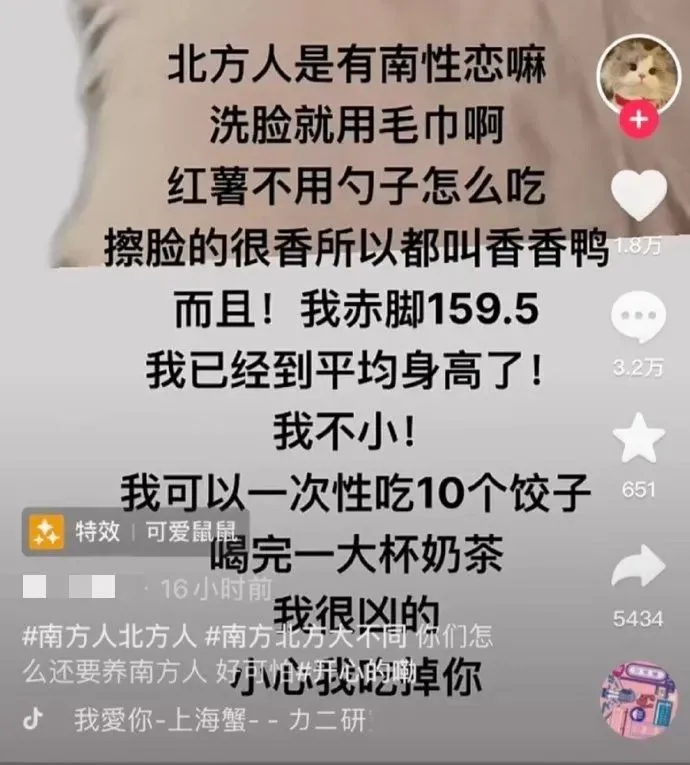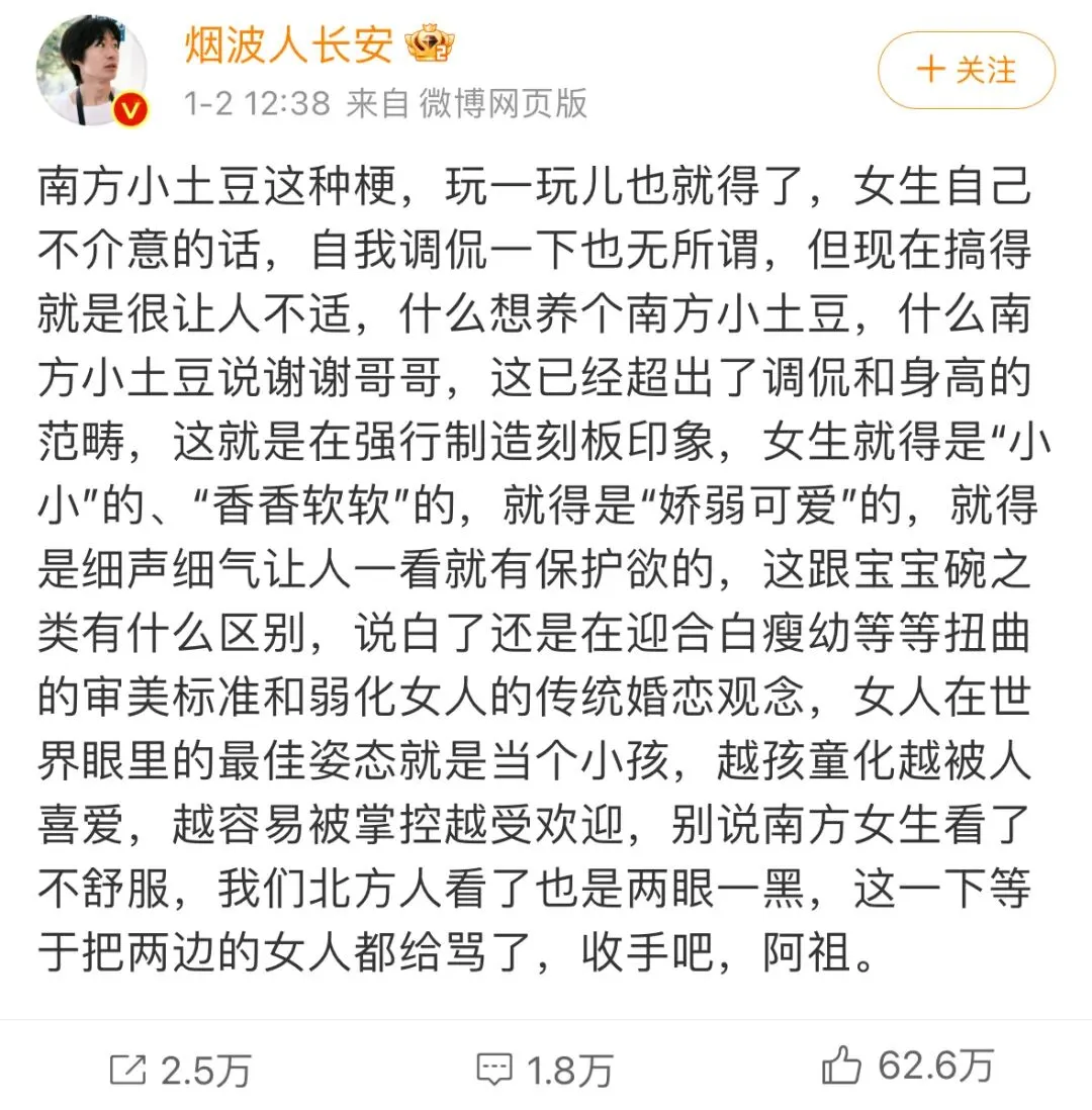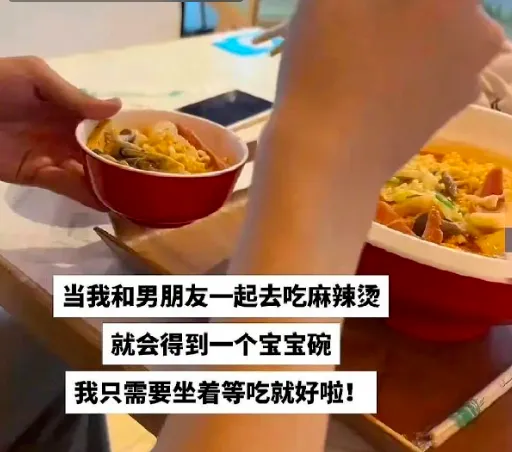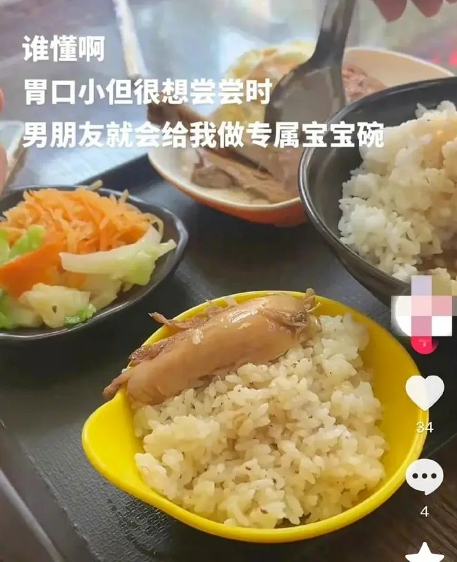 ......................................................................比如小碗不能叫小碗,要叫“宝宝碗”,面条要叫“宝宝面”。很多女生喜欢晒出,和男朋友出去吃饭时,男朋友从大碗里分出一点吃的放在小碗里给自己。这种“把自己当小孩一样照顾”的举动,就成了一种“宠爱”的象征:“谁懂啊,胃口小但很想尝尝时,男朋友就会给我做专属宝宝碗”;“当我和男朋友一起去吃麻辣烫,就会得到一个宝宝碗,我只需要坐着等吃就好啦!”“就算是在学校,当我不想吃饭的时候,就会被哄着吃宝宝碗,多吃一口都会被夸一次。”不懂就问,这是在开幼儿园吗?你们都去吃宝宝碗吧,我要吃太奶碗,祖母锅。比如来月经时穿的安心裤,要叫“小孩裤”,卫生巾要叫“尿不湿”。女生打出的嗝要叫“奶嗝”,放的屁要叫“奶屁”,声音要叫“奶屁音”;比如,很多男生喜欢炫耀,女朋友的腰还没有自己的巴掌大小,单只手就能盈盈一握;炫耀女朋友身高150,发脾气就像小朋友闹着玩,其他人都羡慕完了;炫耀女朋友皮包骨般瘦弱的手臂:“不好意思,朋友们,小土豆女朋友让我谈到了”;炫耀女朋友脸肉嘟嘟的像“小宝宝”,她喝个汤也要捏着她的脸拍个视频;再比如,这段时间越来越火的“南方小土豆”梗,把南方人都比作娇小可爱、软软糯糯的小土豆。甚至衍生出了“南性恋”的说法:“好想养一个南方的小土豆。洗脸用小毛巾,吃红薯要用小勺勺,会自己觅食,一不开心就钻进我怀里哼哼唧唧。”“我不小!我可以一次性吃10个饺子,喝完一大杯奶茶。看着“南方小土豆”和“北方大汉子”在评论区的互动,让人简直有自戳双目的冲动。“这已经超出了调侃和身高的范畴,这就是在强行制造刻板印象。女生就得是小小的、香香软软的,就得是较弱可爱的,细声细气让人一看就有保护欲的。说白了还是在迎合白幼瘦等扭曲的审美标准和弱化女人的传统婚恋观,越孩童化就越被人喜欢,越容易被掌控就越受欢迎。”......................................................................