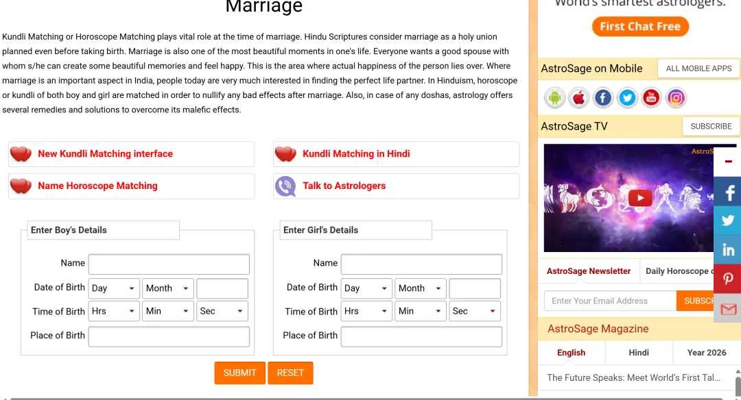 Ashtakoot match免费匹配度分析报告网址:https://www.astrosage.com/freechart/matchmaking.asp(复制任意浏览器打开)