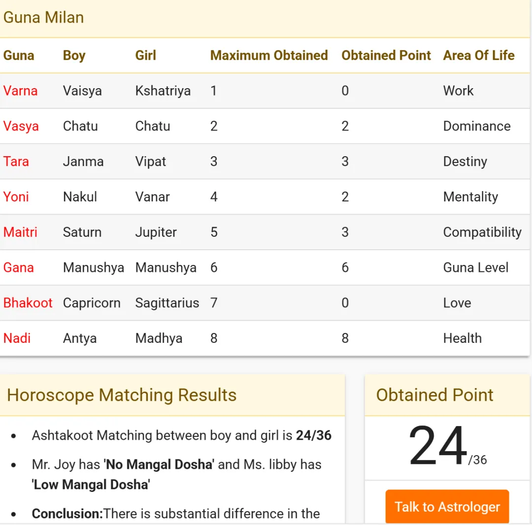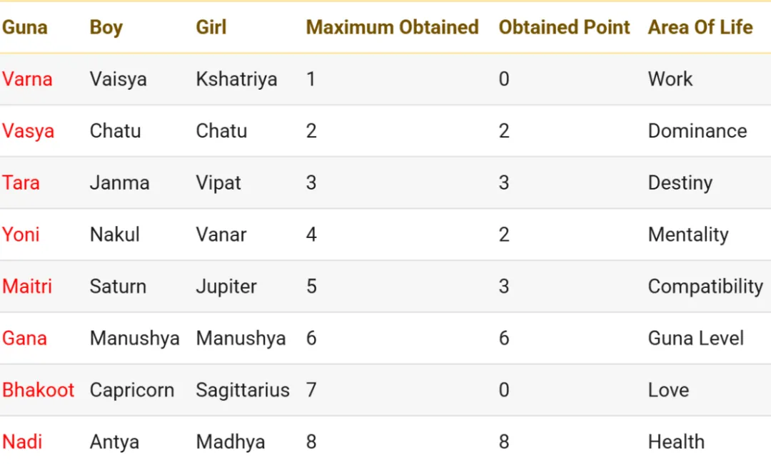 1、打开后就能看到这个页面,输入双方的出生地址、年月日时便可进行匹配度分析。3、把页面往下拉就能看到两人合盘的匹配度分数、以及8个指标分数可以看到总分数24分,还不错,但只看到分数是远远不够的,这份报告主要查看两个部分,第一个是总分数,第二个是八项指标。报告八项指标加起来总分数一共是36分,而每项的比重是不同的,也就导致每项分数不同。如果满分制是100,通过24/36*100四舍五入是67分,按照这个系统规定及格分是18分来看,24分超出了及格分约0.8。整体表现是还行、还不错,但如果要达到优秀,分数则要达到29分以上。但我们用18/36*100最后得出50来看,18分只到达了总分的一半,保险起见,最好还是达到22分以上会更好。如果总分数低于18分,是不建议婚恋的,你们在一起会影响彼此运势、健康、子嗣,你们的认知、人格、三观极其不匹配,如果强行婚恋则会引发狗血、争吵,或严重的后果。如果是在18——21分的区间,双方也将面临过大的差距,存在的问题一部分会随着时间磨合变得契合,一部分就难以磨合了,还是存在一定的困难性,关系具备挑战性,可以尝试婚恋,但需要双方都抱有成长思维,在关系处理中积极学习。分数在22——28分的区间,可以尝试婚恋,双方匹配度还不错,以上方面会有些小摩擦,但通过时间磨合会变得越来越契合,这个区间跨度大,分数越高匹配度越高,在27分(包含27分)以上已经很不错了。分数在29——36的区间,你们是天作之合,这里的分数达到了优秀,你们的认知、人格、三观都相似/互补,双方在一起后,运势和幸福感都有所提升,双方协调度很高,且会给双方带来财运、事业运,是非常完美的区间分数。来到了第二部分——匹配度分析中的精华Guna Milan,中文称属性的匹配。一共分为八项,分别是:Varna、Vasya、Tara、Yoni、Maitri、Gana、Bhakoot、Nadi.1、Varna(社会属性、精神层面)占比一分,基于月亮星座,将等级分为四种:传统上认为男方Varna应不低于或等于女方,代表男方有能力引导家庭。而男生月亮星座落在吠舍 (商人)Vaiśya,女生月亮星座落在刹帝利 (武 士) Kṣatriya。很明显这条是是不达标的,如果这条不达标,代表你们在社会上的工作可能会不一样,世俗成就追求也不同。比如女方月亮星座属性是刹帝利,那么她想达成的世俗成,是制定规则用权力保护群众、国家,使自己拥有行政能力(国家管理者、公务员、警察、军人、权威人士都属这个阶层)。而男生的月亮星座属性是吠舍,他想达成的社会成就,是用自己的经商能力创造更多的财富,成为有钱人(商人、投资者、企业家都属于这个阶层)那这些不同会造成什么影响呢?最多就是你们世俗发展路径上不同,还有是工作缺乏共同话题。但很明显这条不影响什么,大多数人这条不达标都不影响亲密关系,所以这条在总分上只占比1分。2、Vashya (相互吸引力和控制力 )占比2分, 双方月亮星座是否具有天然的支配力,将星座分为五类:虽然有五种分类的理论框架,但在实际进行Vashya匹配计算时,只使用前三种(人类、四足动物、水生动物)。人类 (Nara) → 水生动物 (Jalachara) → 四足动物 (Chatushpada) → 人类 (Nara),用于判断相互影响力。 这个表格里双方月亮星座属性都属于四足动物,因此该项满分。评判标准是一方能“控制”另一方星座可得满分 ,此控制非字面意思的控制,而是指代吸引力。该项评估的是关系中天然的吸引与影响力动态,但因为吸引力并不是关系最主要的因素,更多作用于初识,所以该项只给到2分。3、 Tara ( 健康与命运的和谐)占比3分,通过计算双方月亮所在的星宿位置的关系进行评估。计算方式:从女方星宿位置顺指针数到男方星宿位置/9,根据余数得分。该项评估的是一种宏观、命运的同步以及支持程度,看双方在人生的起伏中是否能互为助力,而不是同时陷入低谷。4、Yoni (性兼容与本能)占比4分,通过双方月亮星宿所对应的动物进行评估,每个星宿对应一种雌性/雄性动物,双方动物象征的关系:该项中双方月亮星宿对应的动物之间关系是中性,所以得2分该分数象征双方在性生活配合中较为一般,无强烈性吸引,需要后天培养默契。Yoni虽然指代性,但还代表信任程度以及情感亲密度,从这一项开始分数占比就高了,我们也知道性在亲密关系中不是最重要的,但也不是不重要,所以占比4分。如果注重性的人群,这项的分数对你们而言是很重要的,但这一项只要不是敌人,关系在中性以上就完全OK了,对于亲密关系而言足够了。5、Maitri (心智、情感与沟通的交流度)占比5分 ,通过双方月亮星座的守护星之间的关系计算。PS:对于Maitri印占中有不同的算法,传统计算中只有5、1分,该网站多出了中性关系的计分,既然如此我们就沿用网站的标准。该报告中,女生的月亮守护星为木星,男生的月亮守护星为土星,双方守护星关系为中性,所以最终得3分。如果守护星是天然的朋友,则双方心智相投,沟通良好。,容易成为精神伴侣,低分则意味着需要更多的耐心和技巧来沟通。这一项强调了心智交流在长期关系中的重要性,从这一项开始,指标逐渐在关系中影响变大,而越到后面的指标越在关系中占据举足轻重的地位。6、Gana (本性、基本性格的匹配)占比6分,将双方月亮星宿的本性气质进行匹配,将人的本性分为三类:Deva (神性):温和、善良、注重精神追求与崇高理想 Manushya (人性):平衡、世俗、注重情感与物质生活 Raks