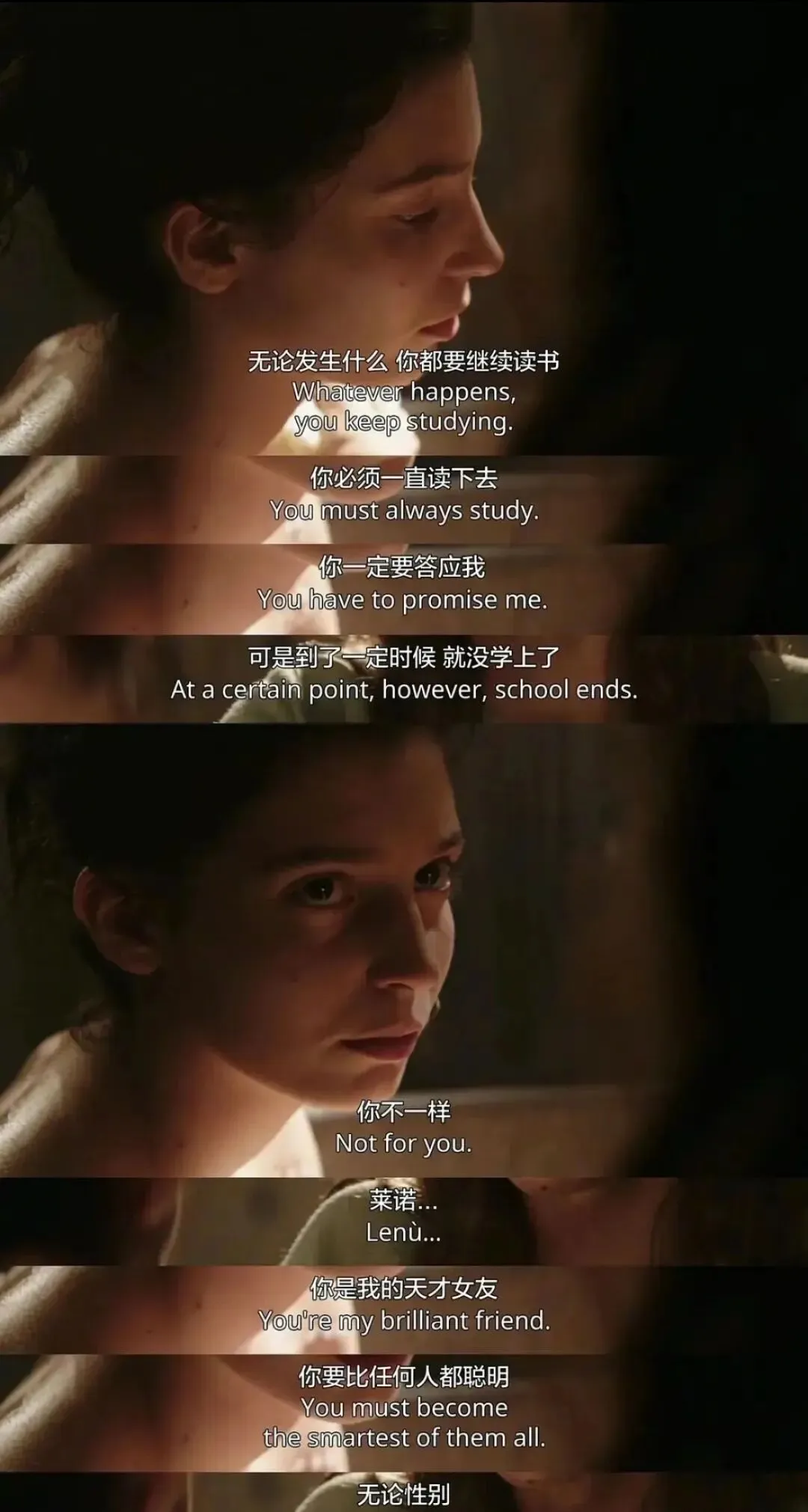 她们是彼此天才的见证者,也是彼此伤痛的共谋。莉拉平静地烧掉自己的第一本小说——她永不回头,哪怕前面是灰烬。这种决绝是她力量的来源,也注定了她的悲剧性。