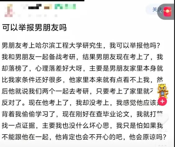 男朋友考上哈尔滨工程大学研究生,可以举报他吗?