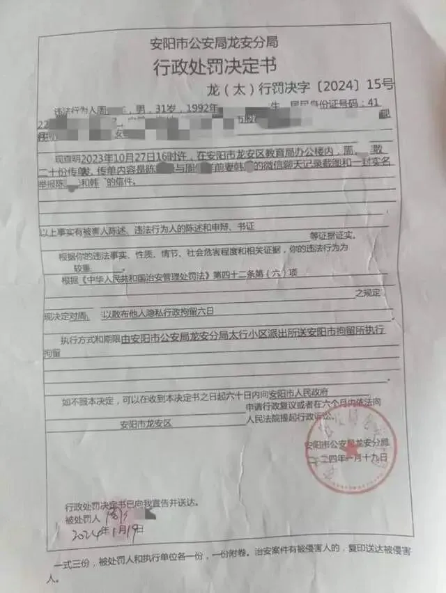 周某因在龙安区教育局办公楼内散发20份传单,内有其前妻韩某与陈先生的聊天记录截图,被认定散布他人隐私被行政拘留6日。
